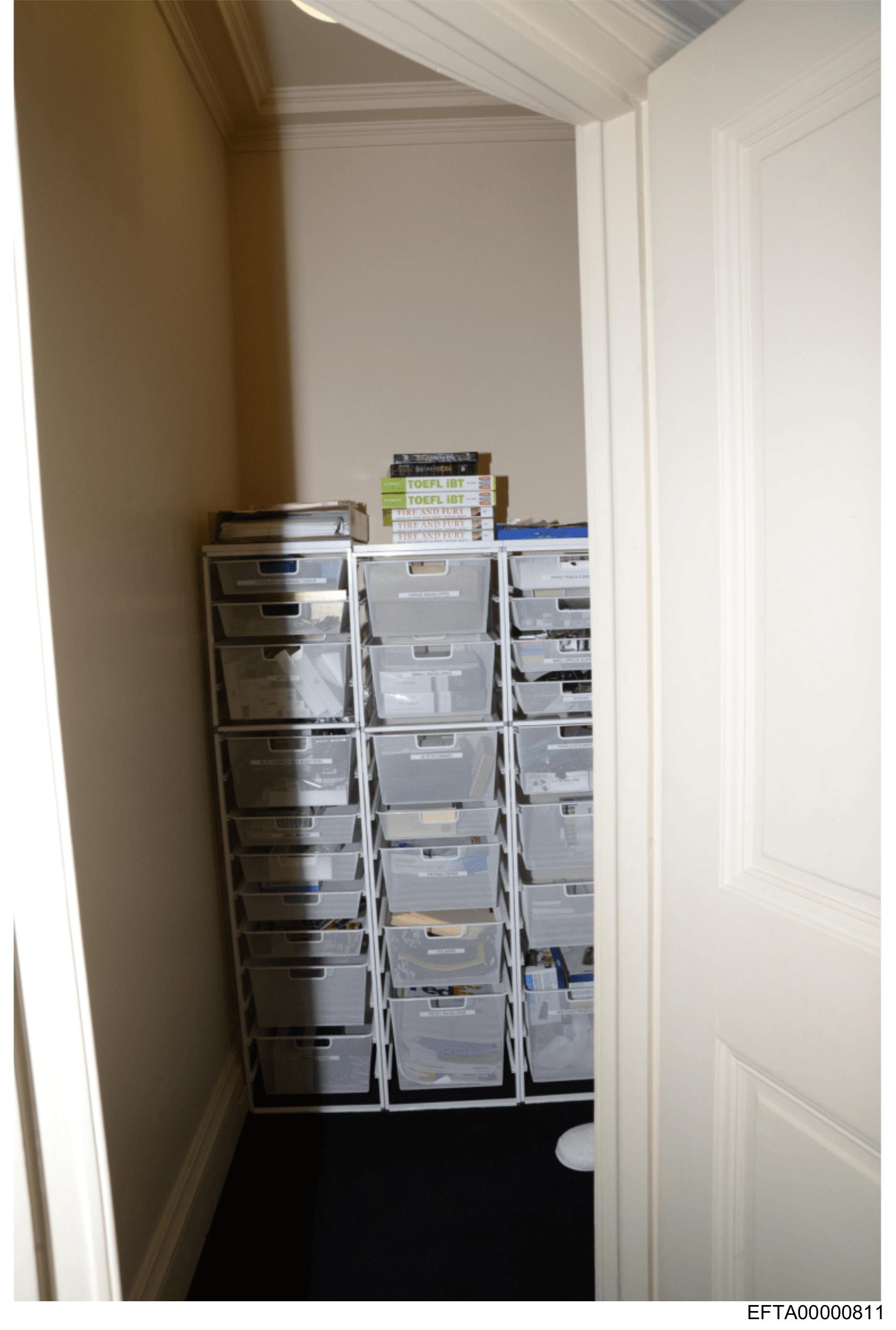 The image shows an interior view of a room with a doorway leading to another area. There is a stack of plastic storage bins against one wall, filled with various items that are not clearly identifiable due to the angle and distance from which the photo was taken. The walls appear to be painted in a neutral color, possibly white or light gray. At the bottom of the image, there is some text that reads "ET 2018" but without additional context, it's unclear what this refers to. The style of the photograph seems candid and unposed, capturing a moment in an everyday setting.