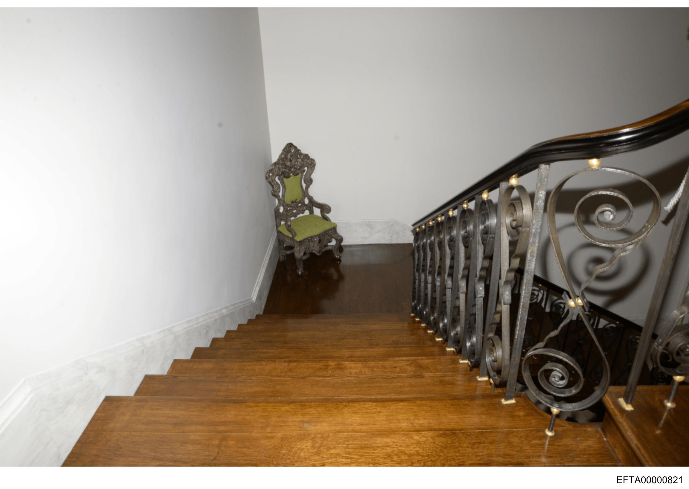 The image shows a staircase with a metal railing. The steps appear to be made of wood and have a dark finish. At the bottom of the stairs, there is an upholstered chair with a patterned fabric, possibly green or teal in color. The setting seems to be indoors, and there's no text visible in the image. The lighting is even, suggesting an indoor environment with overhead lighting rather than natural light.