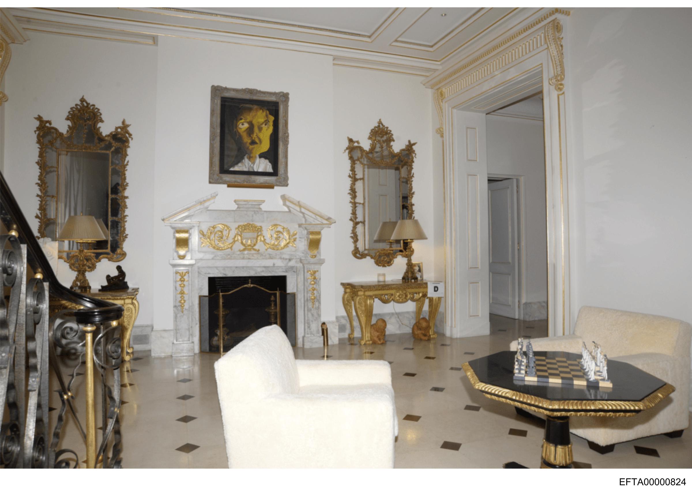 The image depicts an opulent room with a grand staircase leading upwards on the left side of the frame. The walls are adorned with elaborate gold trimmings and large mirrors that reflect parts of the room. Above the fireplace hangs a portrait, which is partially obscured by the angle of the shot. In front of the fireplace is a plush sofa, covered in what appears to be soft fabric. To the right, there's a black table with intricate detailing and gold accents, upon which rests a single small item that could possibly be a decorative piece or an ornament. The floor is tiled with large square tiles, featuring an intricate pattern bordering each one. The overall style of the room suggests luxury and classical elegance, commonly found in palaces or upscale homes.