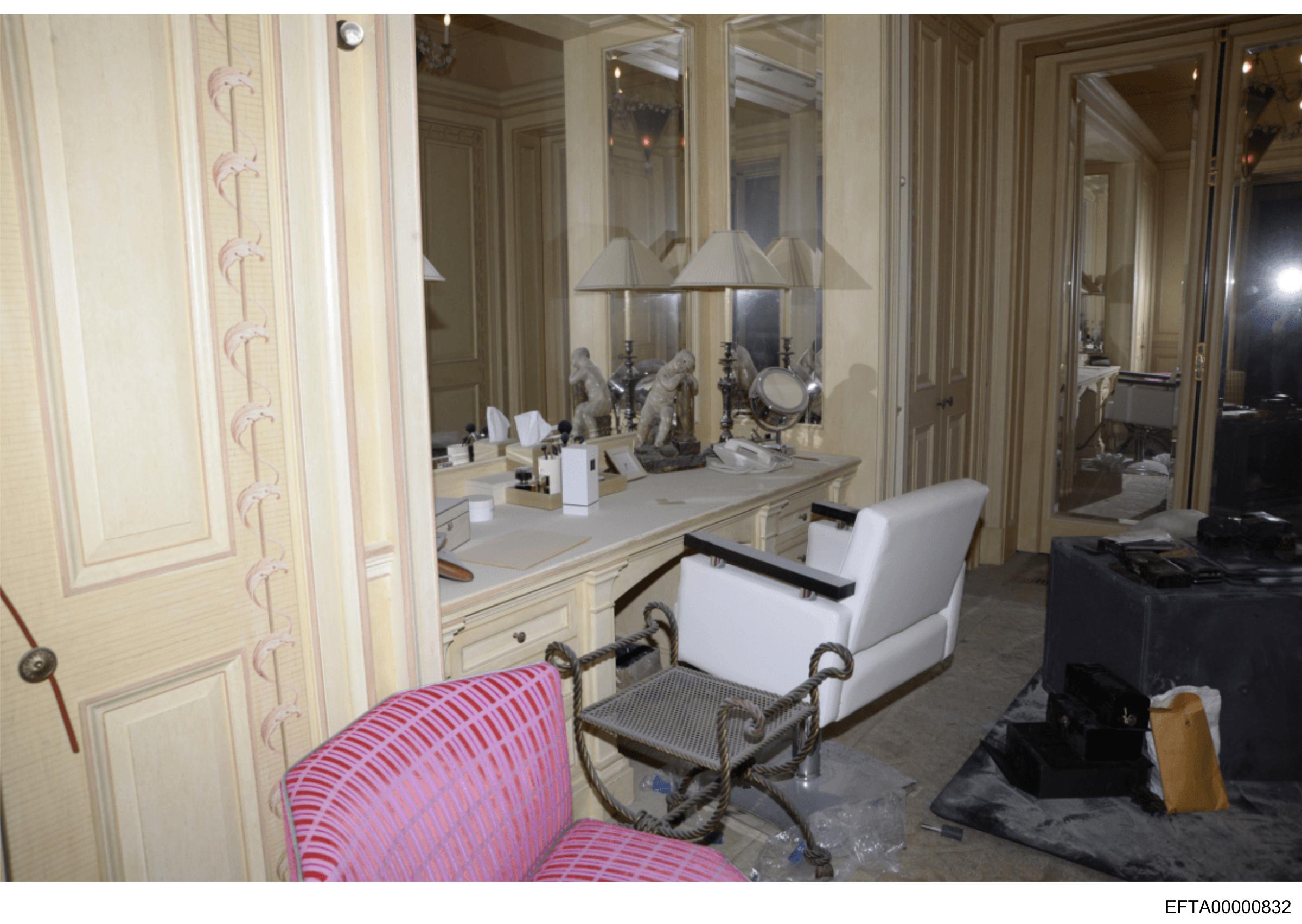 The image presents a scene of a bathroom under renovation. The room is characterized by its brown walls and a large mirror that spans the upper portion of the wall. Dominating one side of the room is a sink, adorned with a lamp above it. To the right of the sink, there's a white chair, possibly used for seating while using the facilities or perhaps as an extra piece of furniture in the home. On the floor next to the chair, there are scattered items, including a black bag and some other debris, suggesting that work is being done in this space. The overall atmosphere suggests that the bathroom is undergoing a transformation from its current state to a new design or layout. The presence of the renovation tools and materials indicates that this process is ongoing and has not yet been completed.