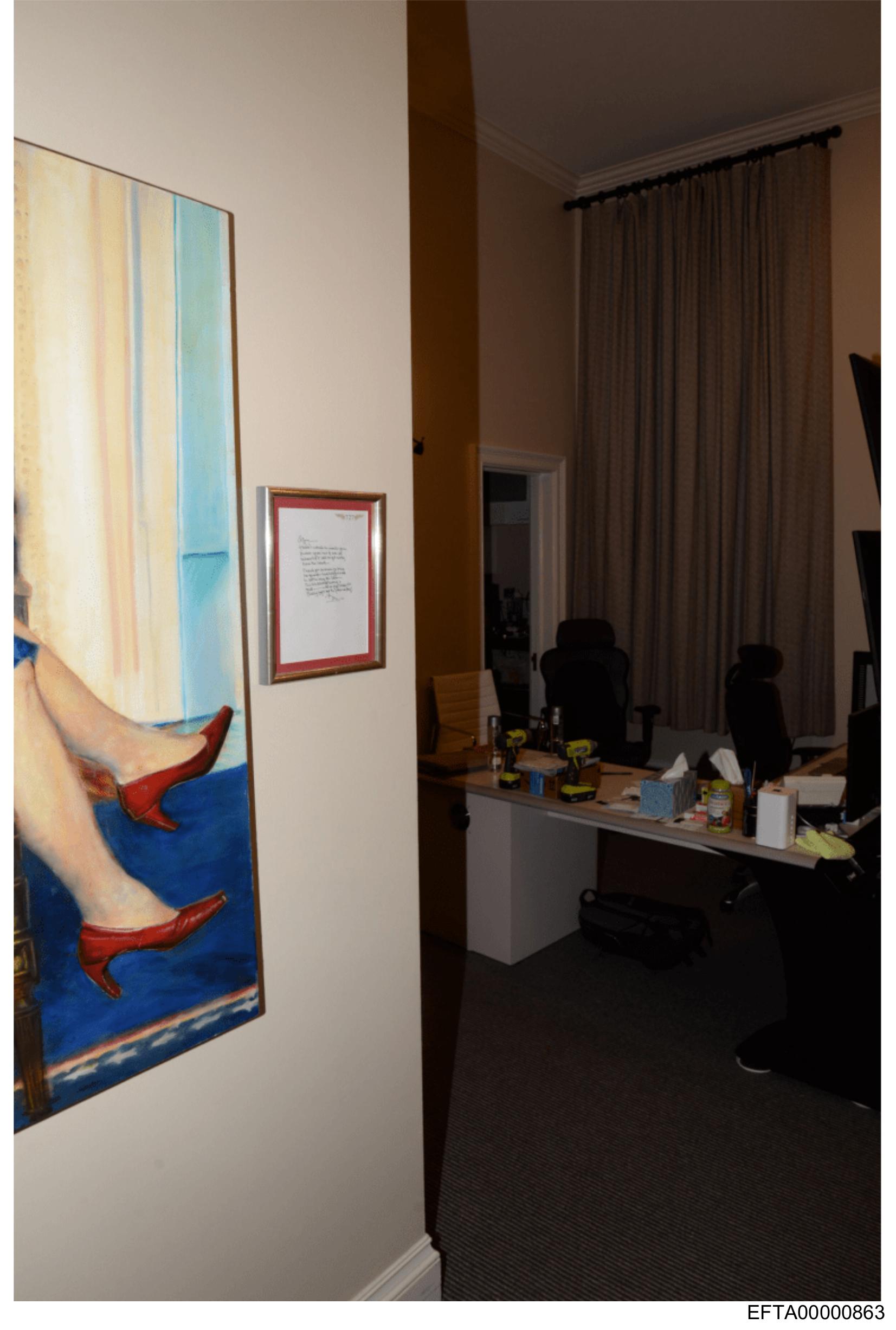 The image shows an interior corner of a room with a focus on two elements: a framed picture hanging on the wall and a desk area with office supplies.
