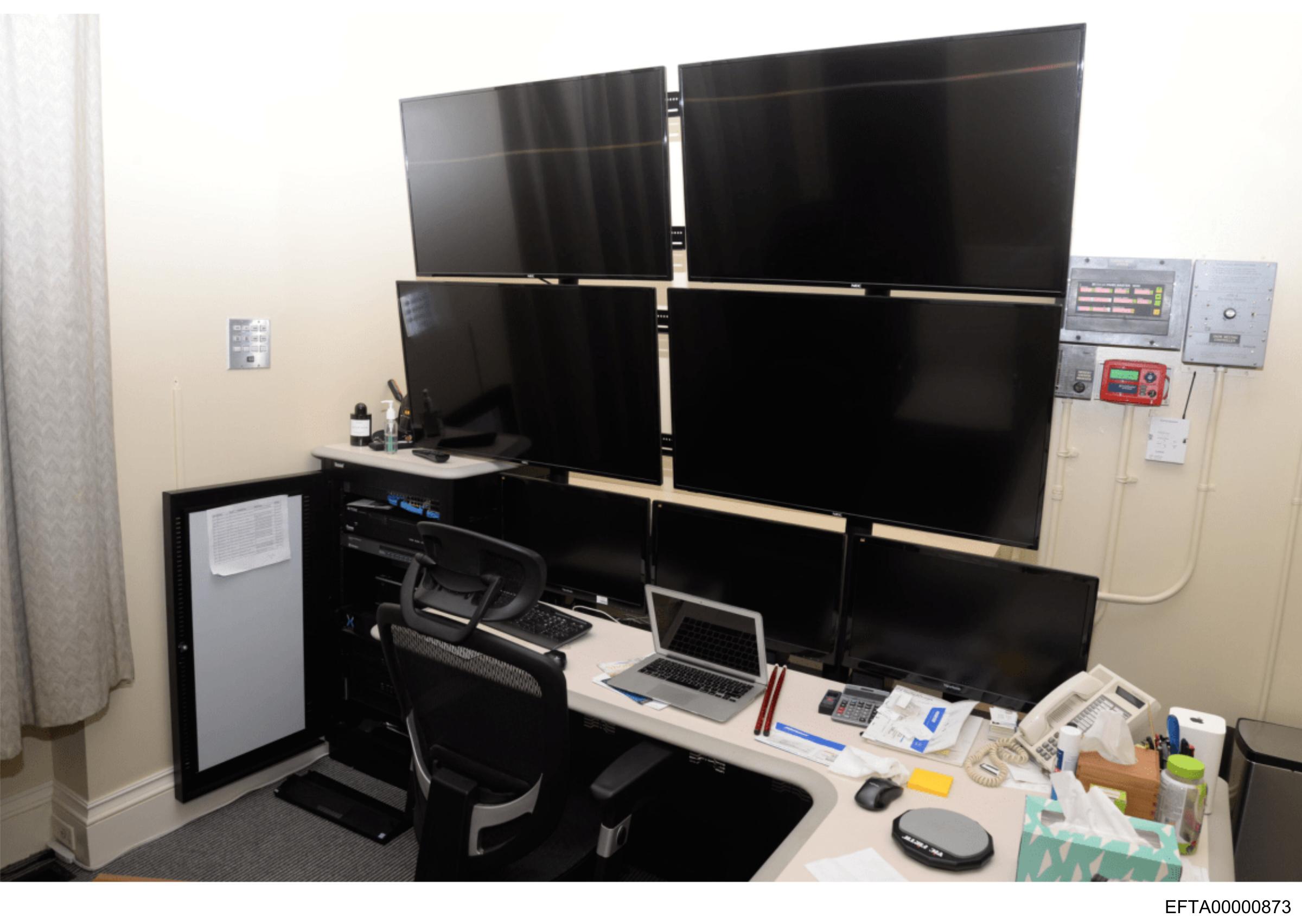 The image shows a room with a desk equipped for video production or editing.