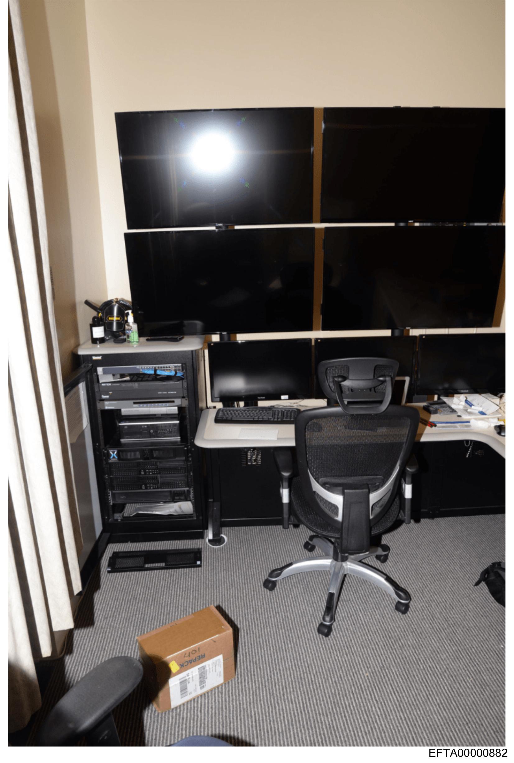 The image displays an office space with a focus on multiple flat-screen televisions mounted on the wall above a computer desk.