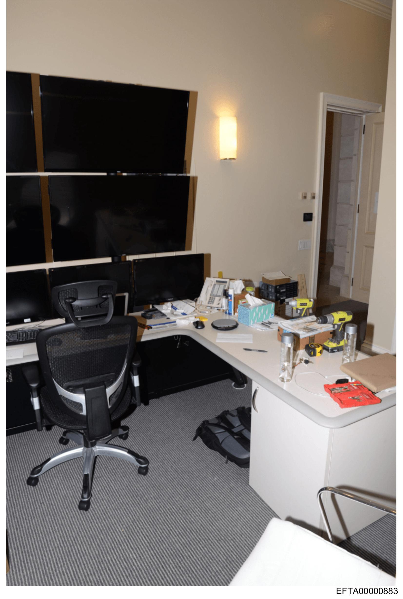 The image shows an office space with a large desk holding various items, including multiple computer monitors and papers.