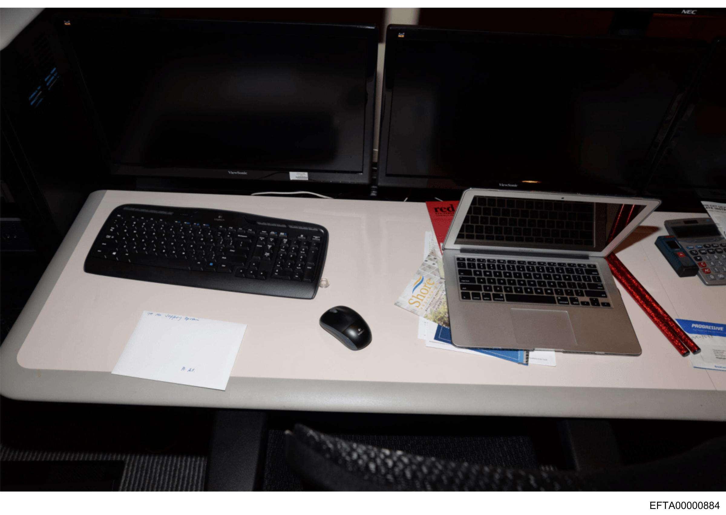 The image shows a close-up view of a desk with various computer equipment on it. Prominently featured is an open laptop with its lid raised and screen facing the viewer. To the right of the laptop, there's a desktop keyboard with its keys clearly visible. Additionally, there appears to be a black mouse to the left of the keyboard. The image has a filter applied that gives it a grainy texture and possibly enhances some colors. There is no text present in this section of the image.