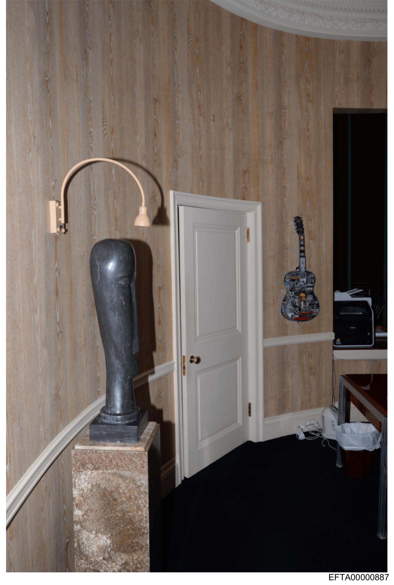The image shows an interior scene with a focus on a hallway that leads to another room. On the right side of the hallway, there is a door and above it hangs a musical instrument, which appears to be a guitar or bass guitar. To the left, a decorative vase sits against the wall, partially obscured by a textured panel. The walls have vertical panels that add texture to the space. There's no visible text in the image.