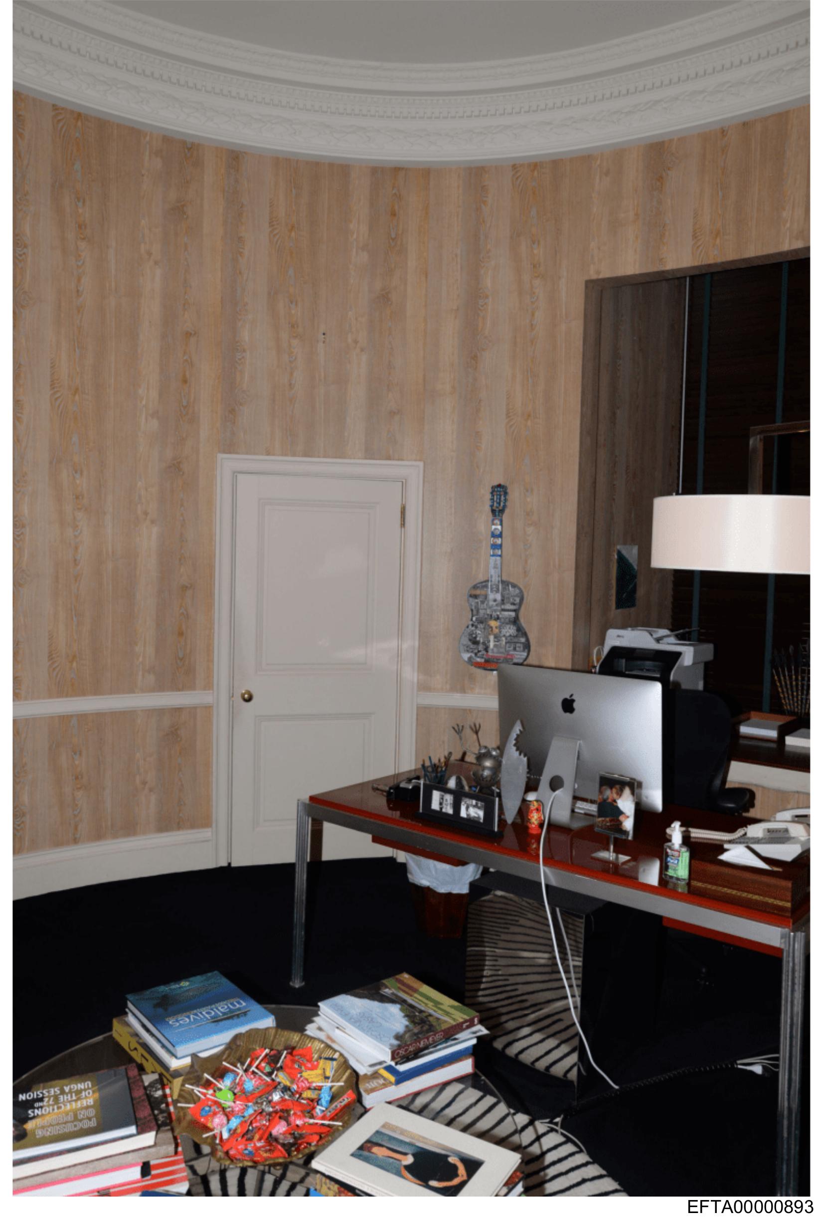 The image shows an indoor room with a classic interior design. There is a desk against the wall, featuring a computer monitor and various items, including what appears to be books and possibly a lamp on top of it. A guitar hangs on the wall above the desk, suggesting that music might play a part in this space. The walls are adorned with wooden paneling, giving the room an elegant and traditional look. There is a door visible, and the floor looks carpeted. The overall style of the image suggests it could be from the late 20th century or early 21st century, given the reference to "2005" in one of the texts present on the image.