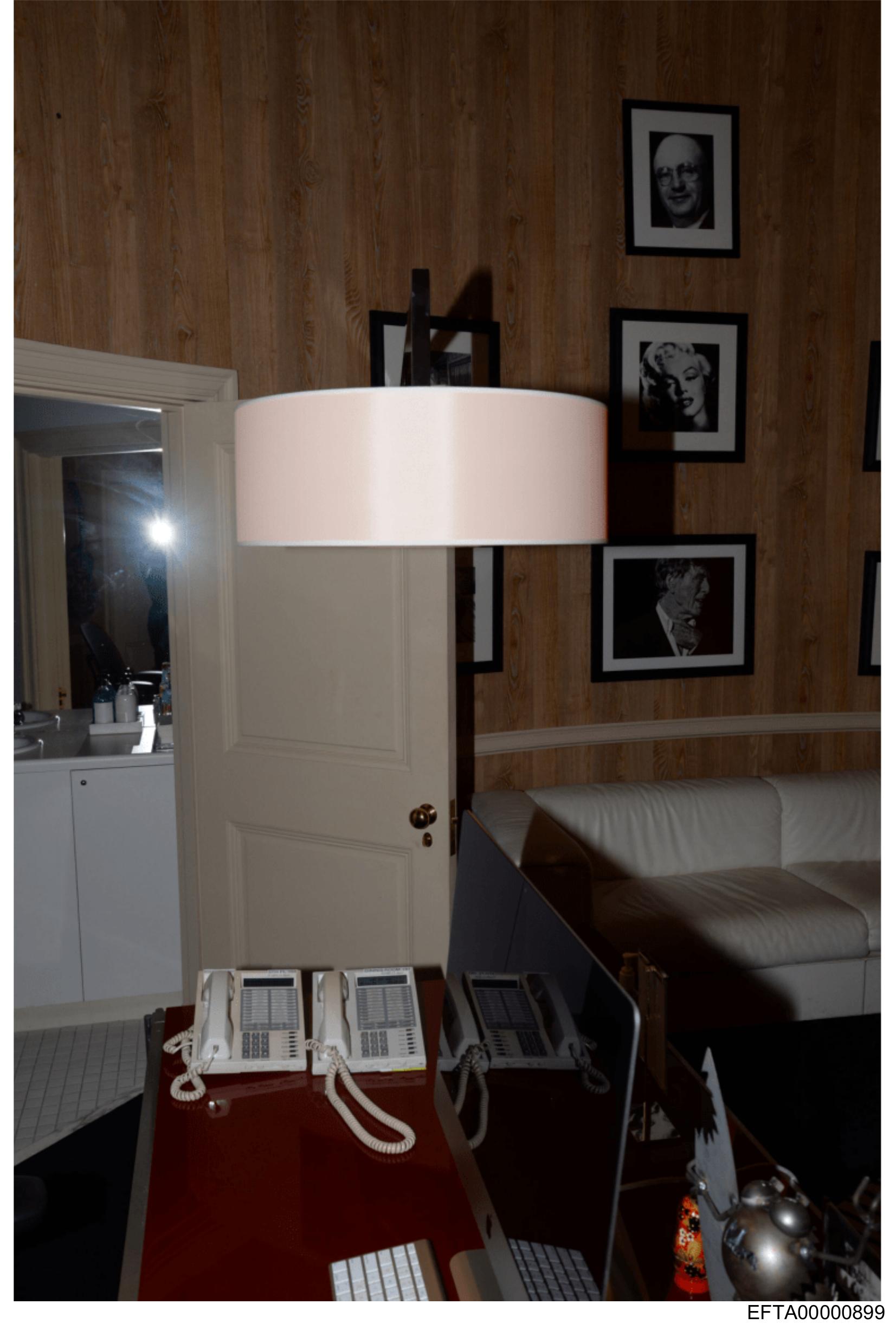 The image depicts a room with distinctive interior design elements. A pink lampshade is prominently positioned on the left side of the frame. The walls are covered in wooden paneling with a glossy finish. There are framed photographs mounted on the wall, one of which features an individual who appears to be male. In the foreground, there's a dark-colored sofa partially visible, and to its right, what seems to be a desk or table holding various items, including a telephone with a rotary dial. On the bottom left corner, there is a watermark or logo that reads "ETC" followed by the date "2009". The overall style of the image suggests it may have been taken in an office setting with vintage decor.