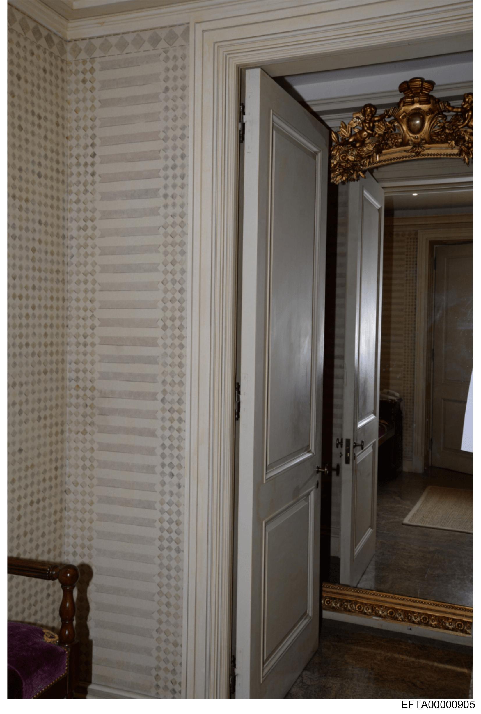 The image shows an interior space with a large door partially open to reveal a hallway leading into another room.