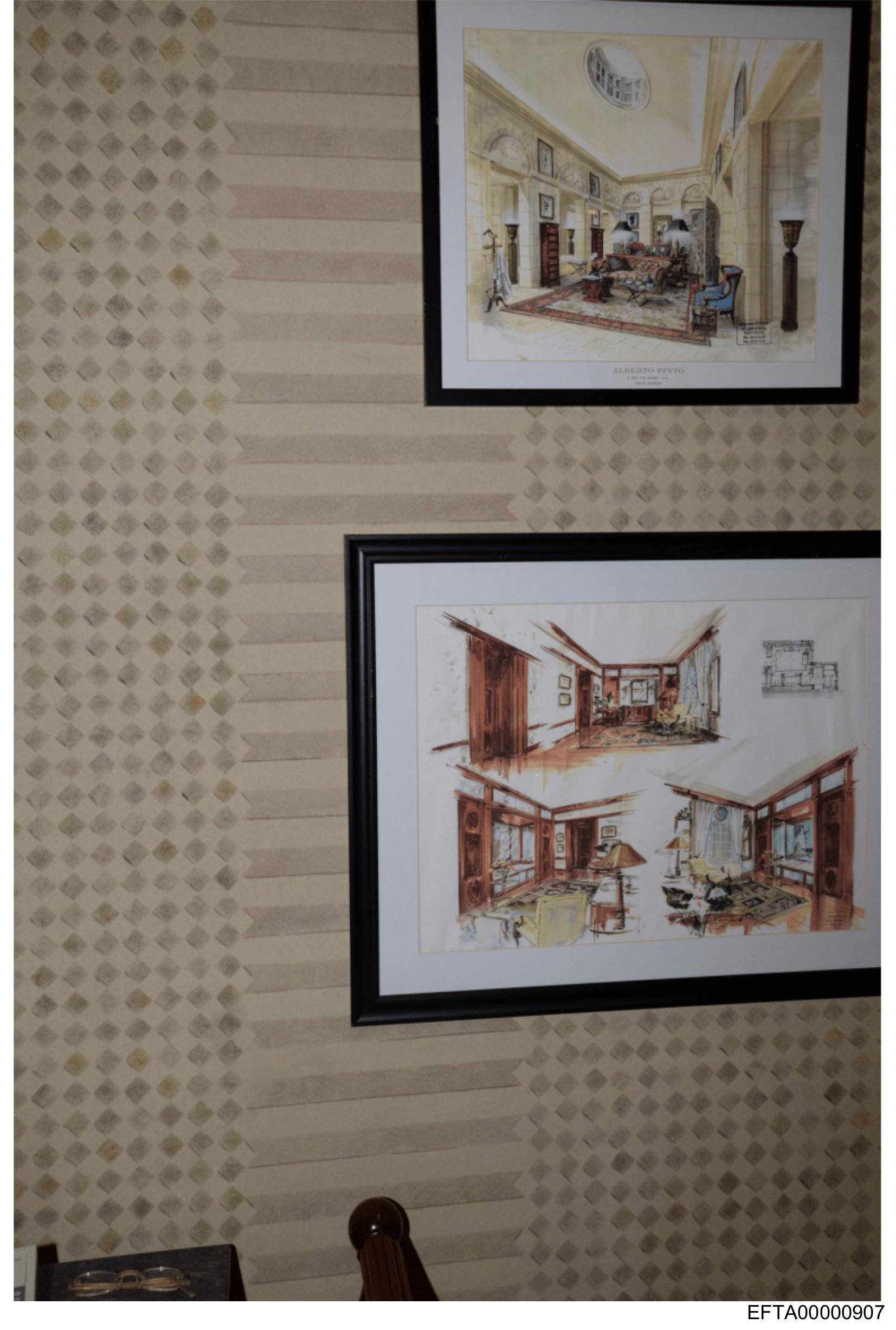 The image shows a corner of a room with framed artwork hanging on the wall.