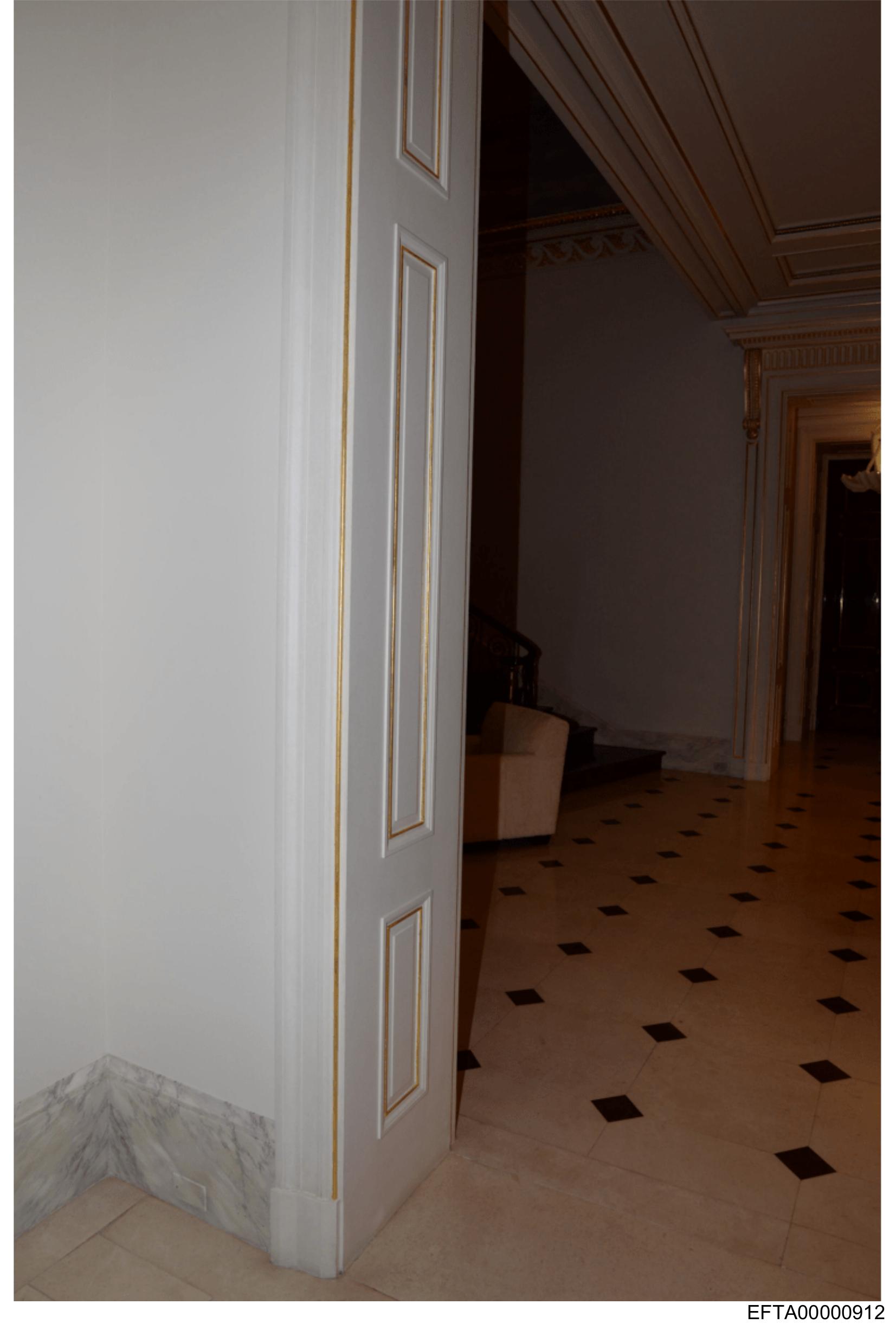 The image shows an interior view of a hallway with classical architectural elements. There are no visible texts, people, or distinctive objects that can be identified from this angle. The floor appears to have a patterned design, likely tiles, and the walls are finished in a smooth material with paneling near the base. A door is partially visible on one side of the corridor. The lighting suggests an indoor setting, possibly at night given the darkness seen through the doorway.