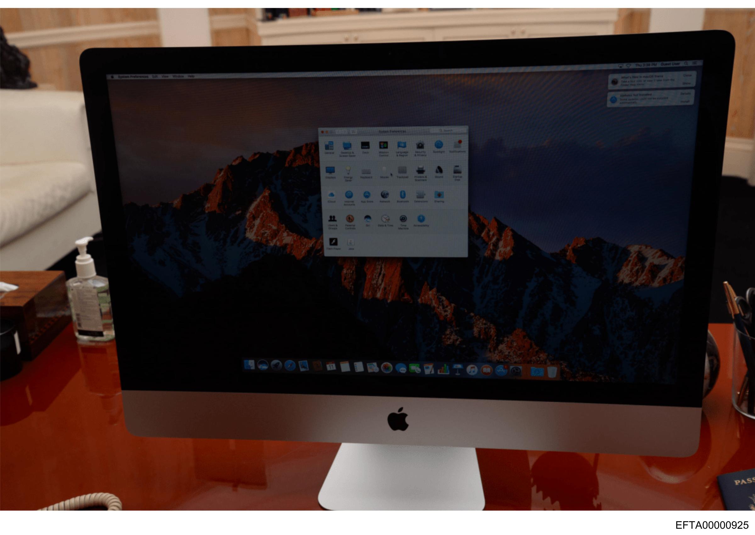 The image shows a close-up of an Apple iMac computer on a wooden desk.