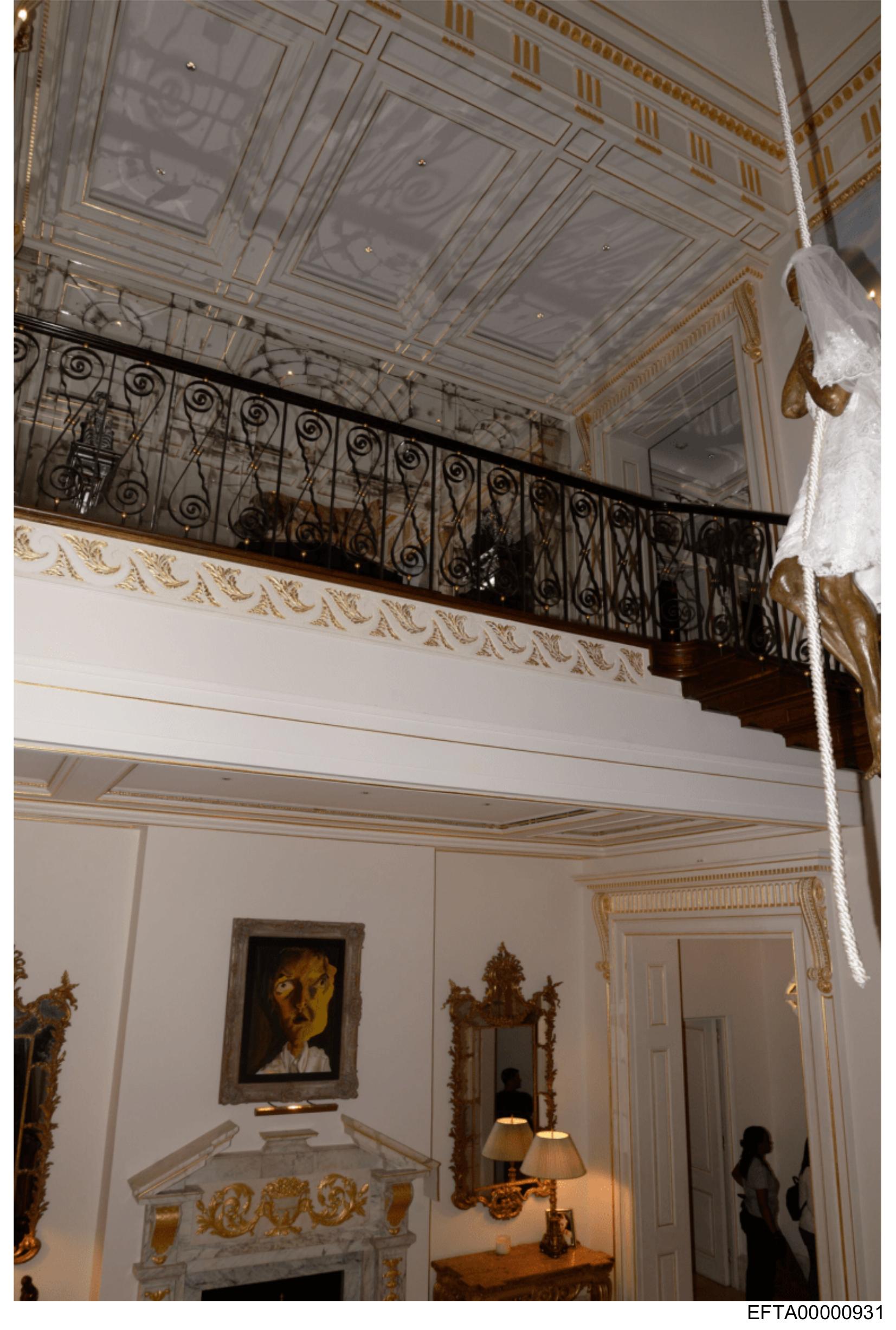The image shows an interior space that appears to be a part of a large building, possibly an old hotel or museum based on the architectural details and furnishings. There is a high ceiling with ornate plasterwork featuring intricate patterns and designs. The room is well-lit, indicating natural light sources not visible in the frame. A balcony railing made of wrought iron is partially visible at the upper edge of the image, suggesting that this space overlooks another area on one or more levels below. The floor level includes decorative elements such as a fireplace with a painted portrait above it and other pieces of art or decorative objects. There are no texts, identifiable locations, or people clearly discernible in this part of the image.