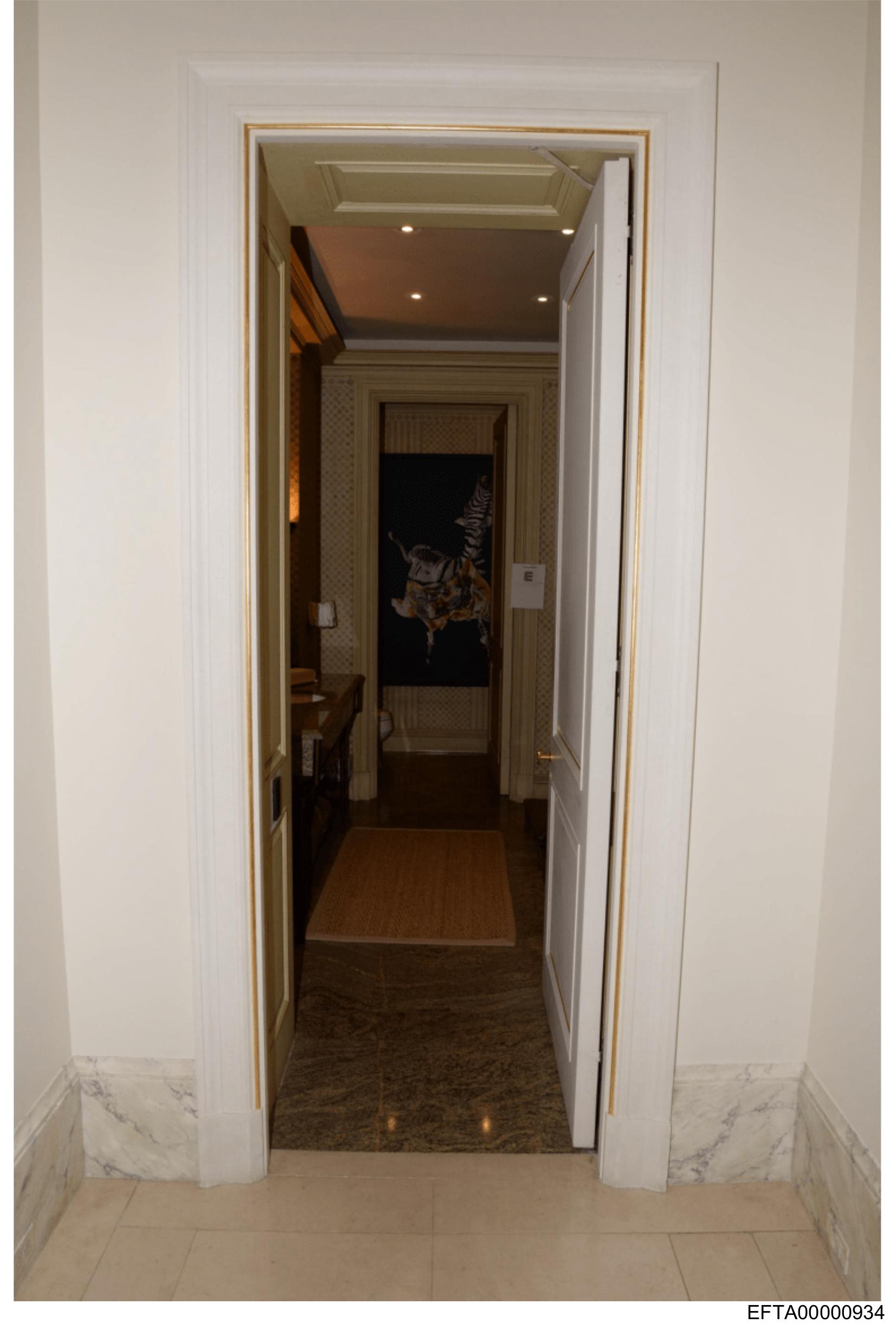 This is a photograph depicting an interior hallway leading to another room. The corridor is lined with cream walls and has doors on both sides, each marked by gold handles that stand out against the white finish. A person can be seen from behind, walking towards the end of the hall, but their identity or appearance is not clear due to the angle and distance. There's a small amount of text visible in the bottom right corner of the image, which appears to say "10297," possibly indicating an identification number or code related to this image. The style of the hallway suggests it could be part of a modern hotel or office building.