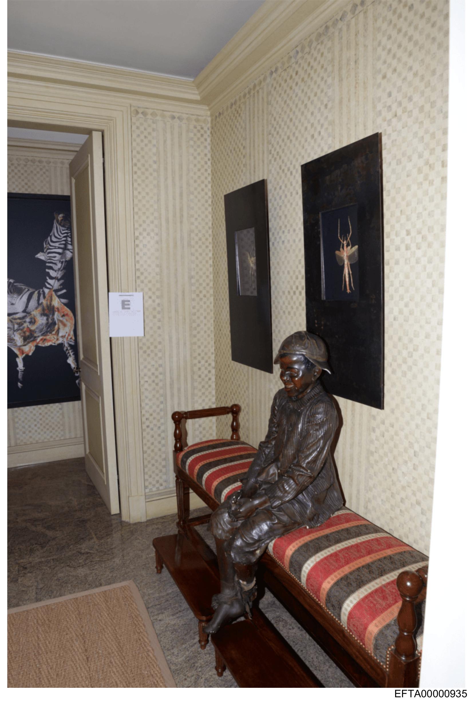 In the image, a person is seated on a bench that's positioned in front of a wall adorned with three paintings.