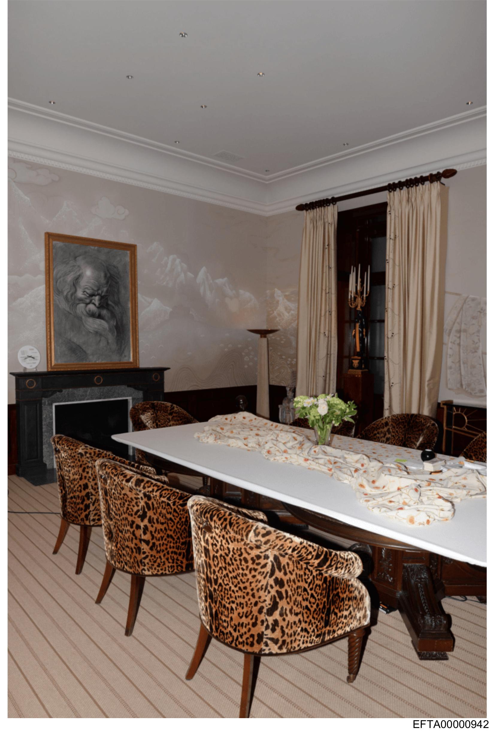 The image shows an interior space that appears to be a dining room. At the center of the room is a large table with several chairs around it. On the table are what seem to be place settings, including plates and possibly napkins arranged neatly. To the left, there is a sideboard or cabinet with decorative items on top. Above the cabinet hangs a framed piece of artwork featuring a face. The ceiling has exposed beams, adding an architectural detail to the room. There is no text visible in the image, and there are no people present. The style of the furnishings suggests a traditional or possibly vintage decor, with patterned chairs that contribute to a classic look.