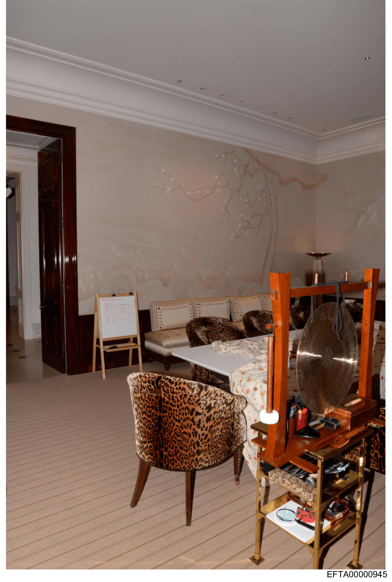 This is an interior photograph of a room that appears to be part of a fancy establishment, possibly a hotel or a high-end residence. In the center of the image, there's a dining table with several items on it, including what looks like bottles and some paperwork. Surrounding the table are luxurious chairs with animal print patterns. There is artwork on the wall behind the table, contributing to an opulent ambiance. The ceiling has recessed lighting and decorative molding, enhancing the room's elegance. On the right side of the image, there's a glimpse of what could be a doorway or entrance to another room. There are no visible texts or people in this section of the photo.