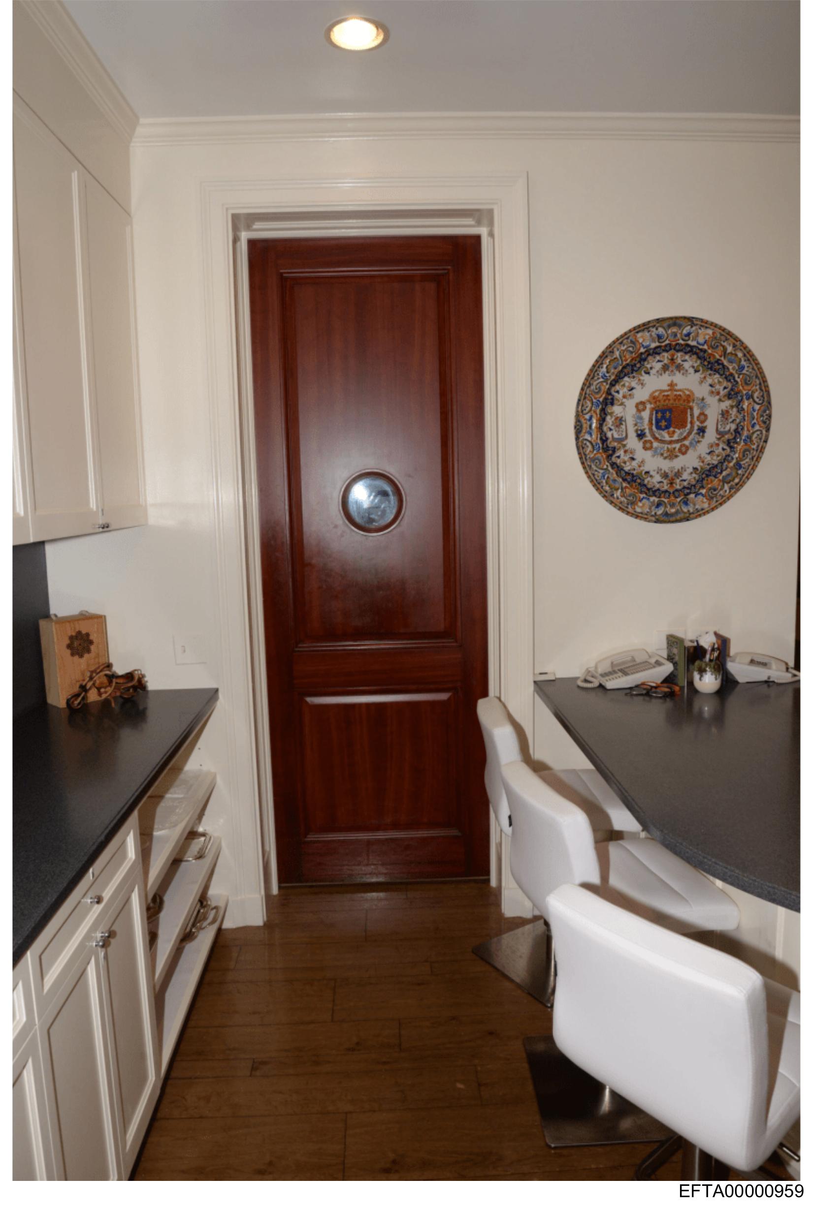 The image depicts an interior space that appears to be a kitchen and dining area. A dark wooden door with a round porthole window is centered on the wall, suggesting access to another room or hallway beyond. Above the door hangs a decorative plate with intricate patterns, which adds a touch of elegance to the room. To the right of the door, partially visible, are what seem to be white barstools, indicating a seating area for dining or casual gathering. The floor is not fully visible but seems to be covered by dark wood planks, complementing the overall warm and traditional aesthetic of the space. There's no text present in the image, and it does not provide any location-specific details.