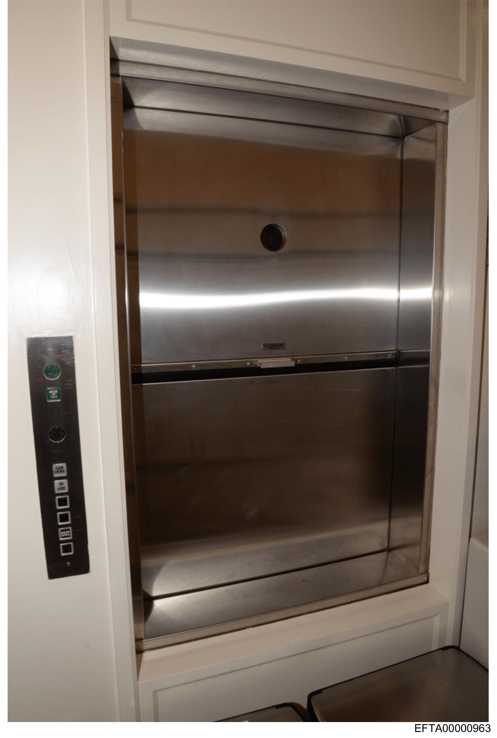 The image shows a stainless steel elevator door with a control panel and buttons on the right side. The background is blurred but appears to be an interior space with white walls and possibly other appliances or equipment that suggest this might be in a commercial kitchen or a similar industrial setting. There are no visible texts, people, or specific locations identifiable from this image.