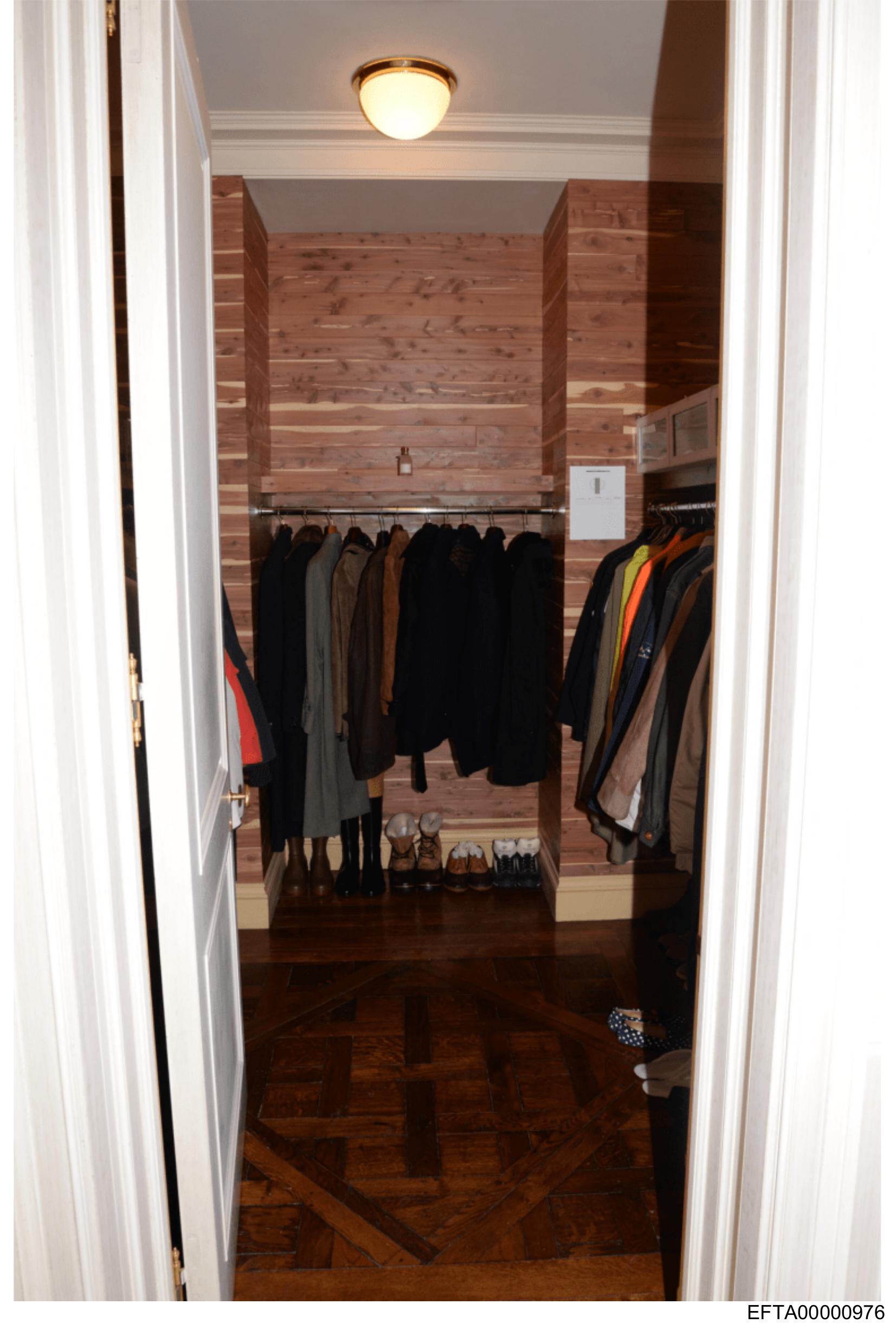 The image shows an interior view of a closet with wooden walls and flooring.