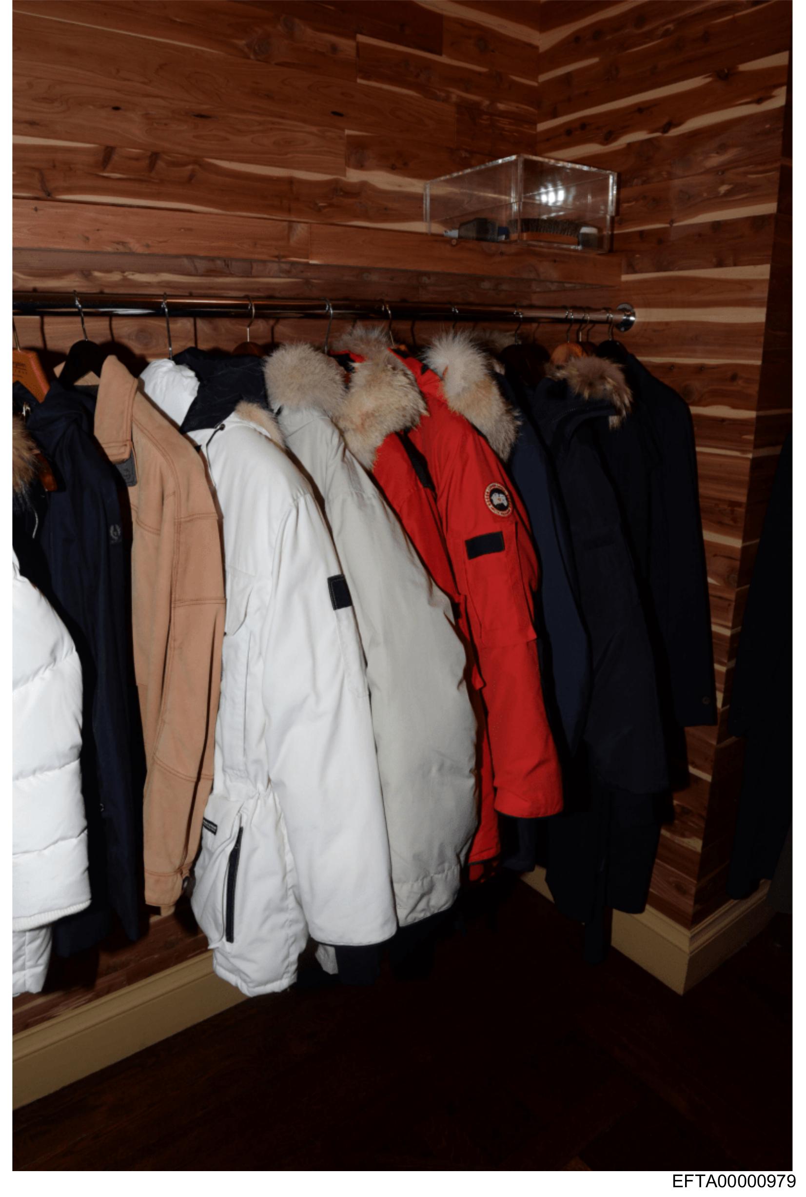 The image shows a collection of winter jackets hanging on hooks against a wooden wall that has horizontal slats.
