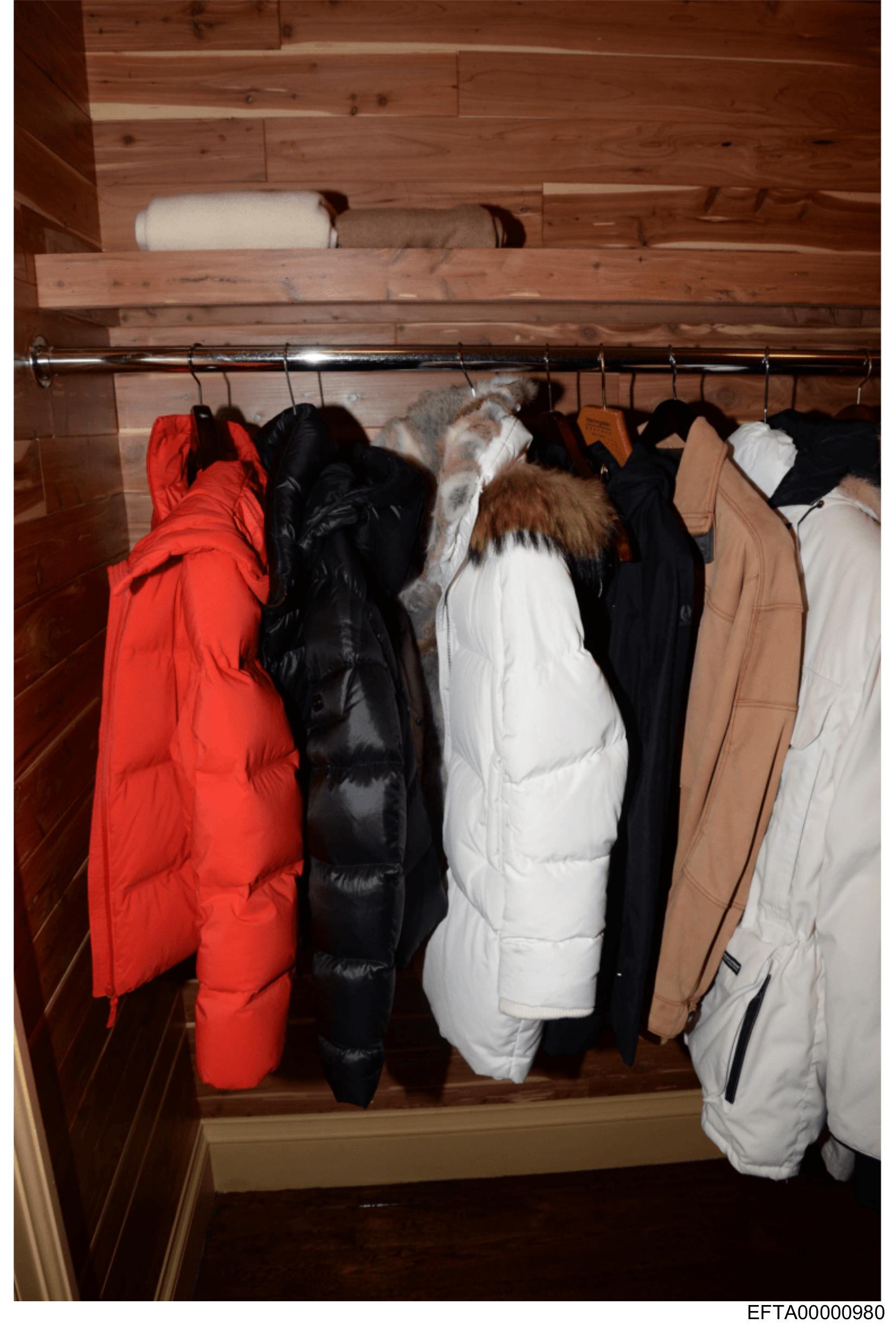 The image shows an indoor coat rack with several winter coats hanging on it.