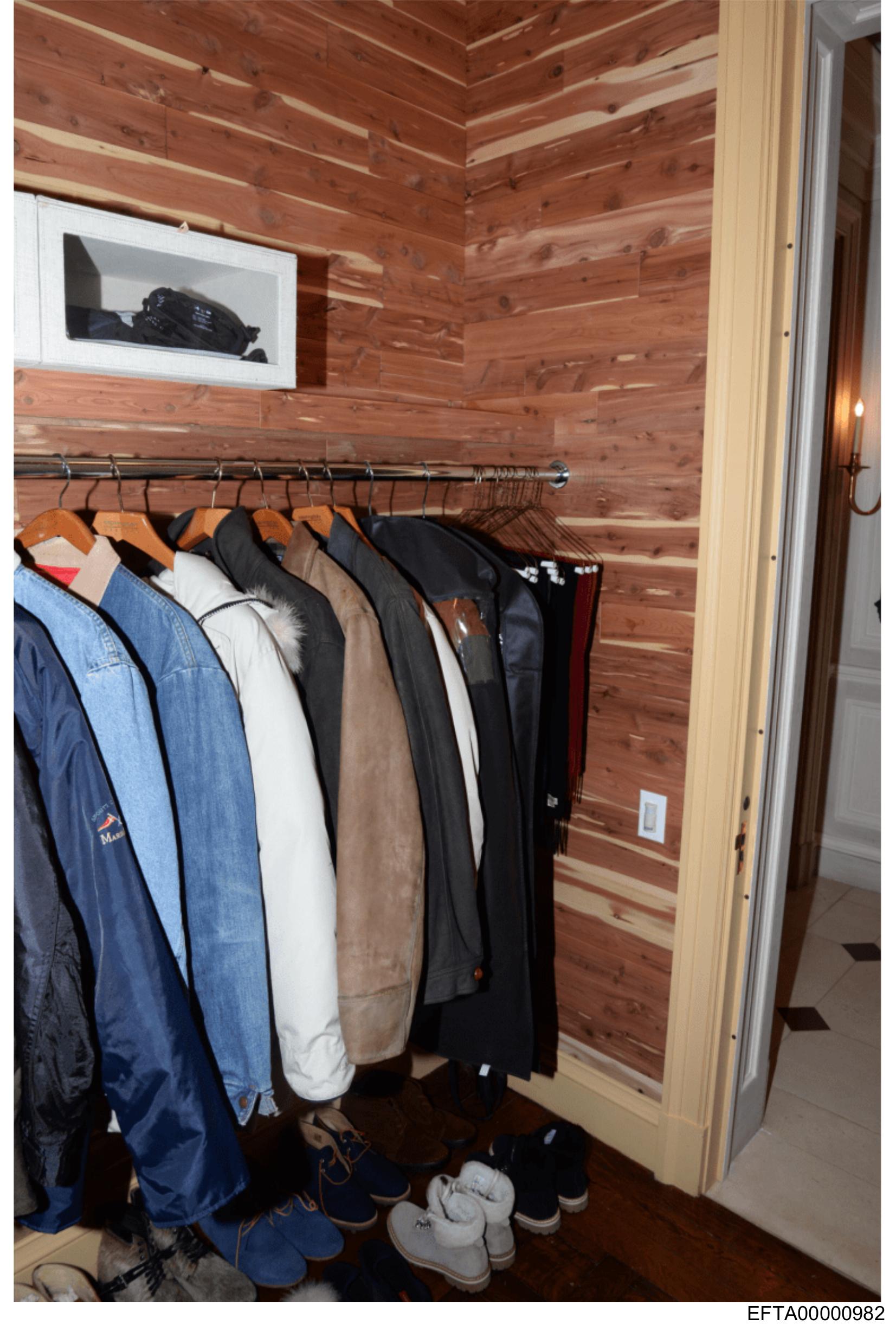 The image shows an interior space with a wooden wall paneling and a metal coat rack mounted on it. The rack holds multiple jackets and what appears to be a pair of jeans. There are no visible texts, people, or recognizable brands that can be confidently identified from this description. The style of the image is straightforward, likely taken for the purpose of showing the storage solution within an indoor setting.