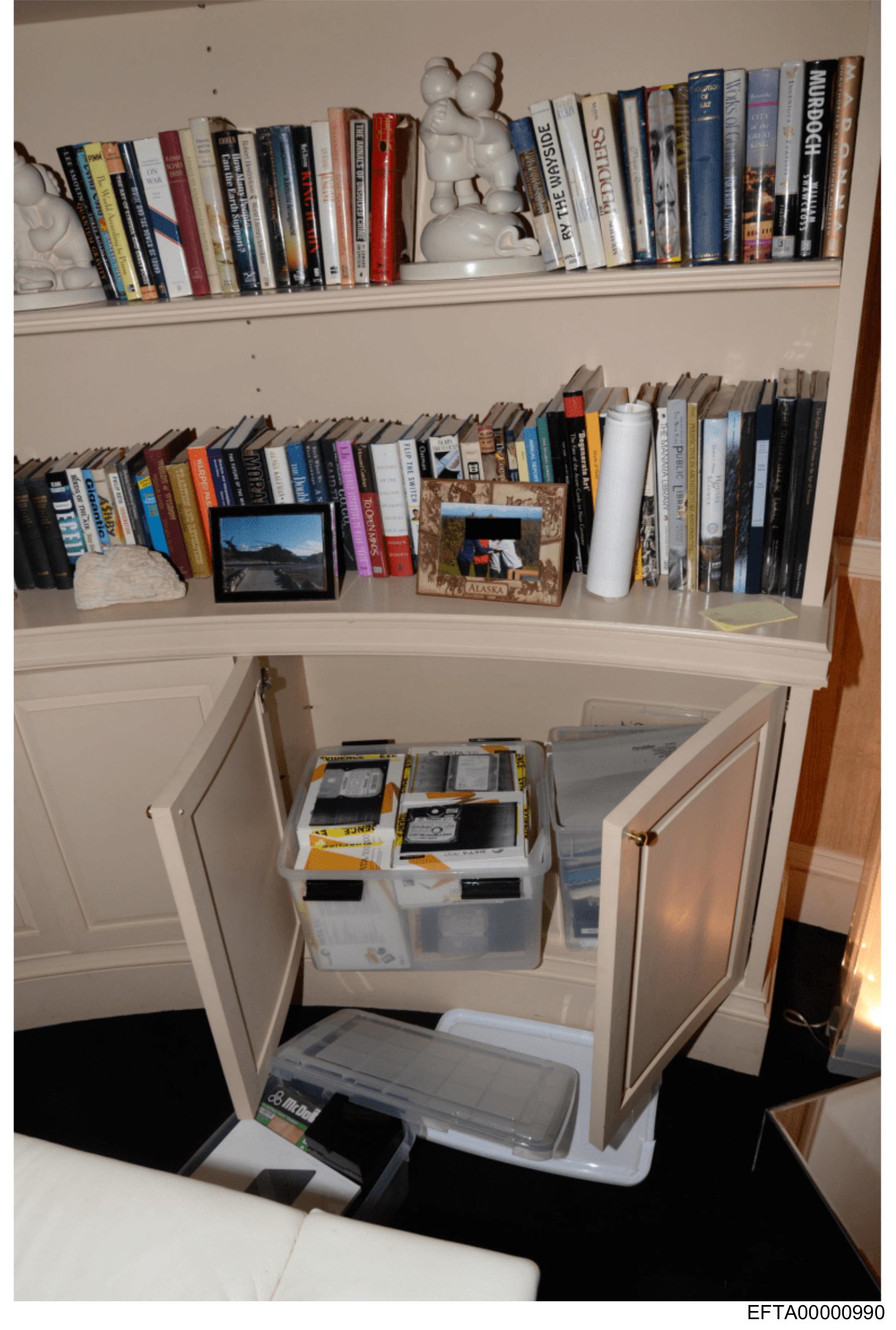 The image shows an interior scene with a bookshelf containing numerous books of varying sizes and colors.