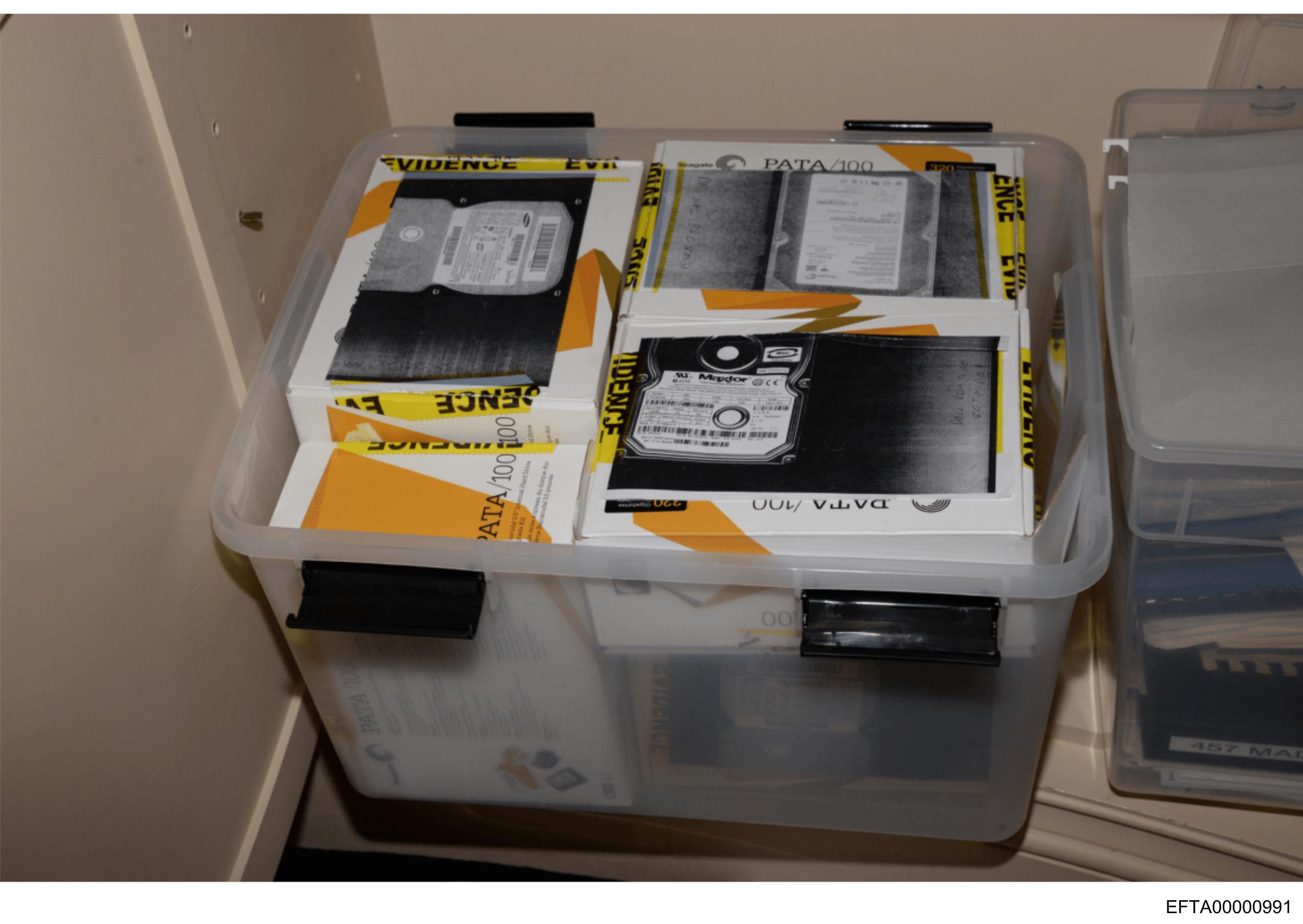 This is a photograph showing an open plastic storage bin containing printed materials and documents.