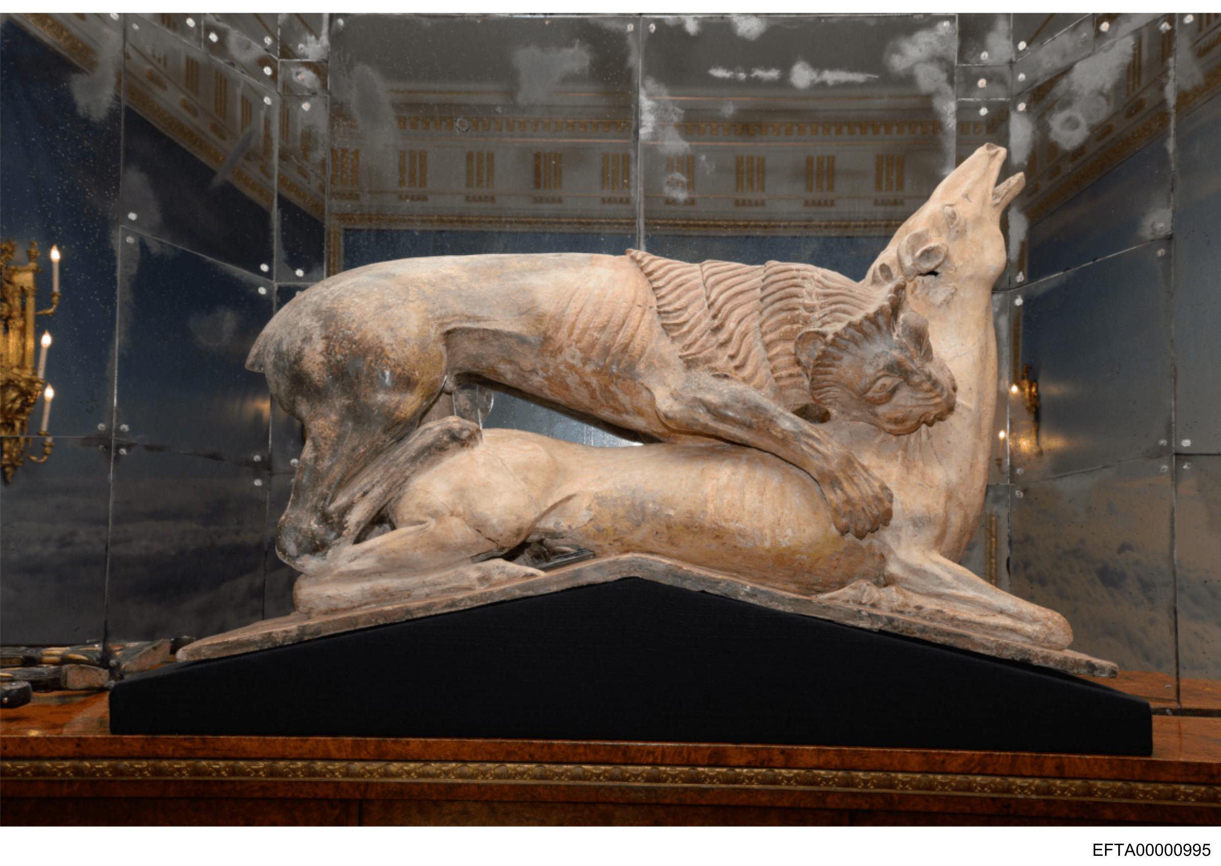The image shows a sculpture on display, featuring two dogs in an intimate pose. One dog is depicted lying down with its head resting on the other dog's back, while the second dog is standing and appears to be in motion, as suggested by its dynamic posture. The dogs are sculpted in a realistic style, capturing fine details that give them lifelike qualities. They are crafted from a material that resembles stone or marble, common choices for such sculptures due to their durability and classic aesthetic. The sculpture is encased within a transparent protective barrier, likely acrylic glass, which indicates that it is a museum exhibit. This barrier not only protects the artwork but also allows viewers to approach closely while maintaining a respectful distance. The background suggests an indoor setting with classical architectural elements, such as columns and decorative plasterwork, typical of museums or galleries where ancient and historical artworks are displayed. There's no visible text in the image that would provide additional information about the sculpture or its context. The focus is solely on the artwork itself, inviting contemplation of its craftsmanship, the story it might tell, and possibly its cultural significance.