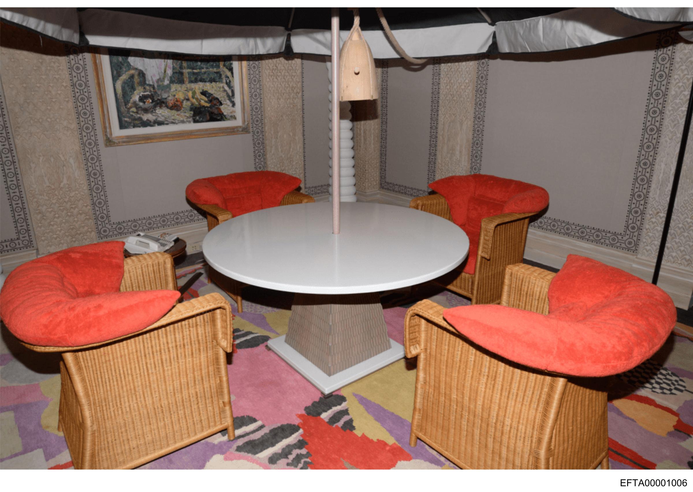 The image shows an indoor setting with a round table at the center, surrounded by chairs upholstered in a vibrant red fabric.