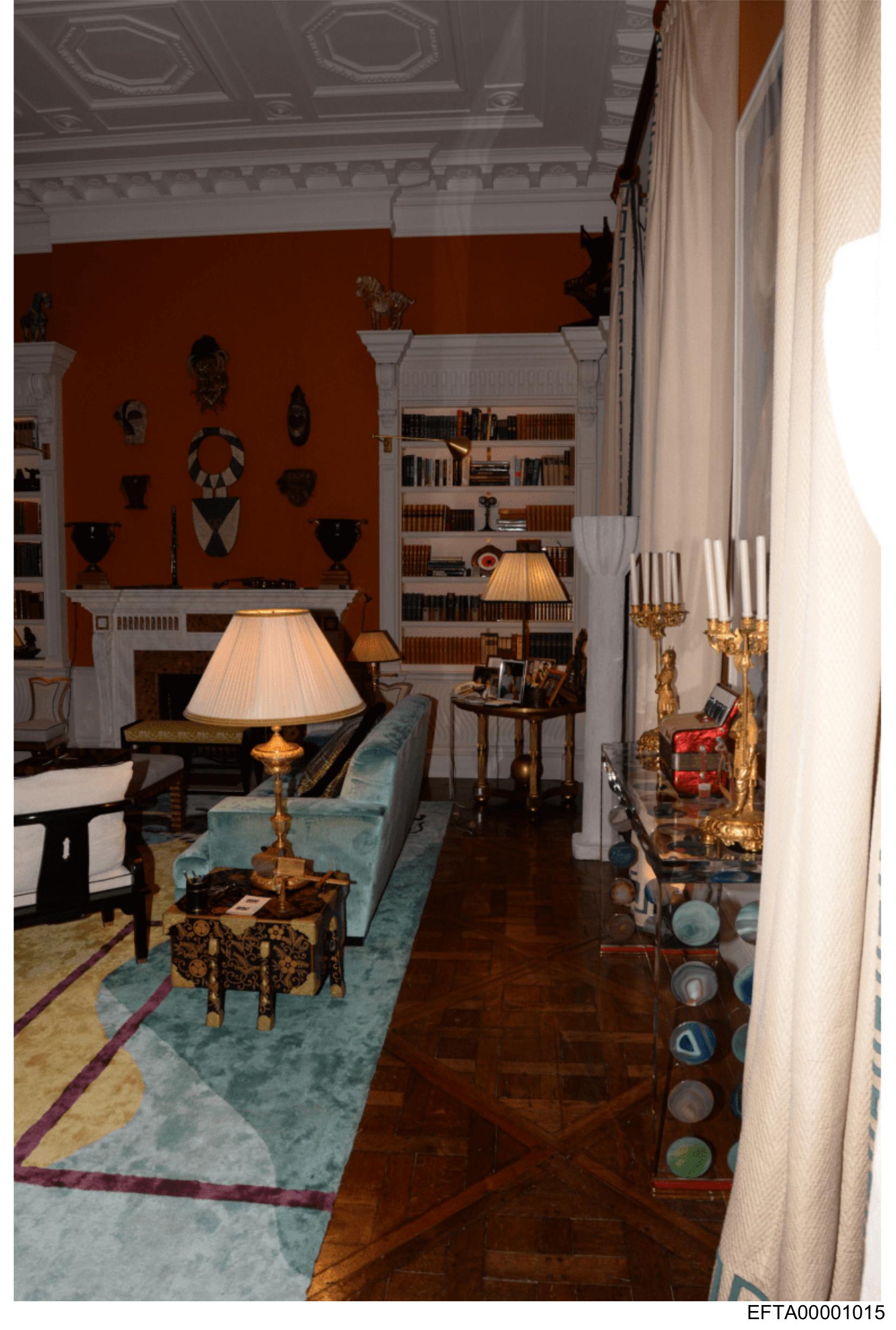 This is an image of a grand room with high ceilings and elaborate decor. The room features wooden flooring with intricate patterns, and the walls are adorned with red wallpapers decorated with gold accents. On one side of the room, there's a large bookshelf filled with various books and decorative objects. A comfortable-looking couch is positioned in front of the bookshelf, accompanied by a coffee table. Above the bookshelf hang several framed pictures or mirrors reflecting the opulence of the room. The lighting is soft, suggesting either natural light diffused through windows not visible in the image or artificial light from unseen sources. The overall atmosphere suggests luxury and sophistication, possibly indicative of a historic or prestigious setting.