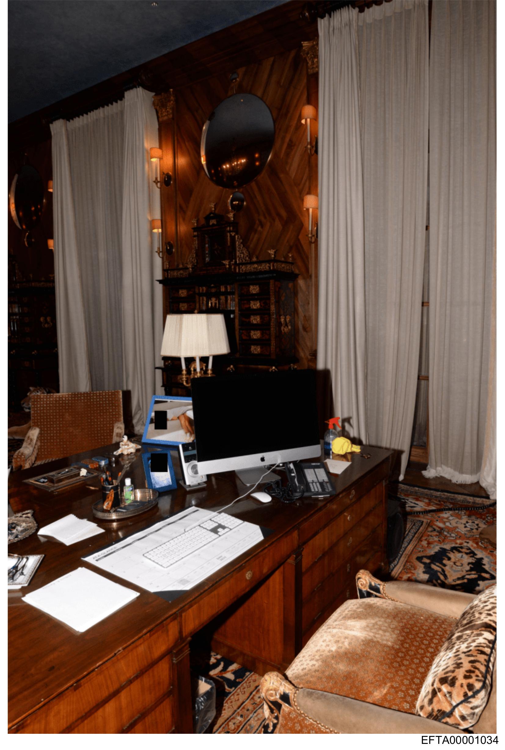 This is a photograph of an office interior with vintage decor. The room features wooden paneling on the walls and a desk with various items including papers, a lamp, a computer monitor, a telephone, and decorative pieces. A window draped with white curtains lets in natural light, and above it hangs a round mirror with ornate details. There's also an object resembling a globe on top of the desk. The style of the image suggests it might be from a historical period or set to evoke a past era.