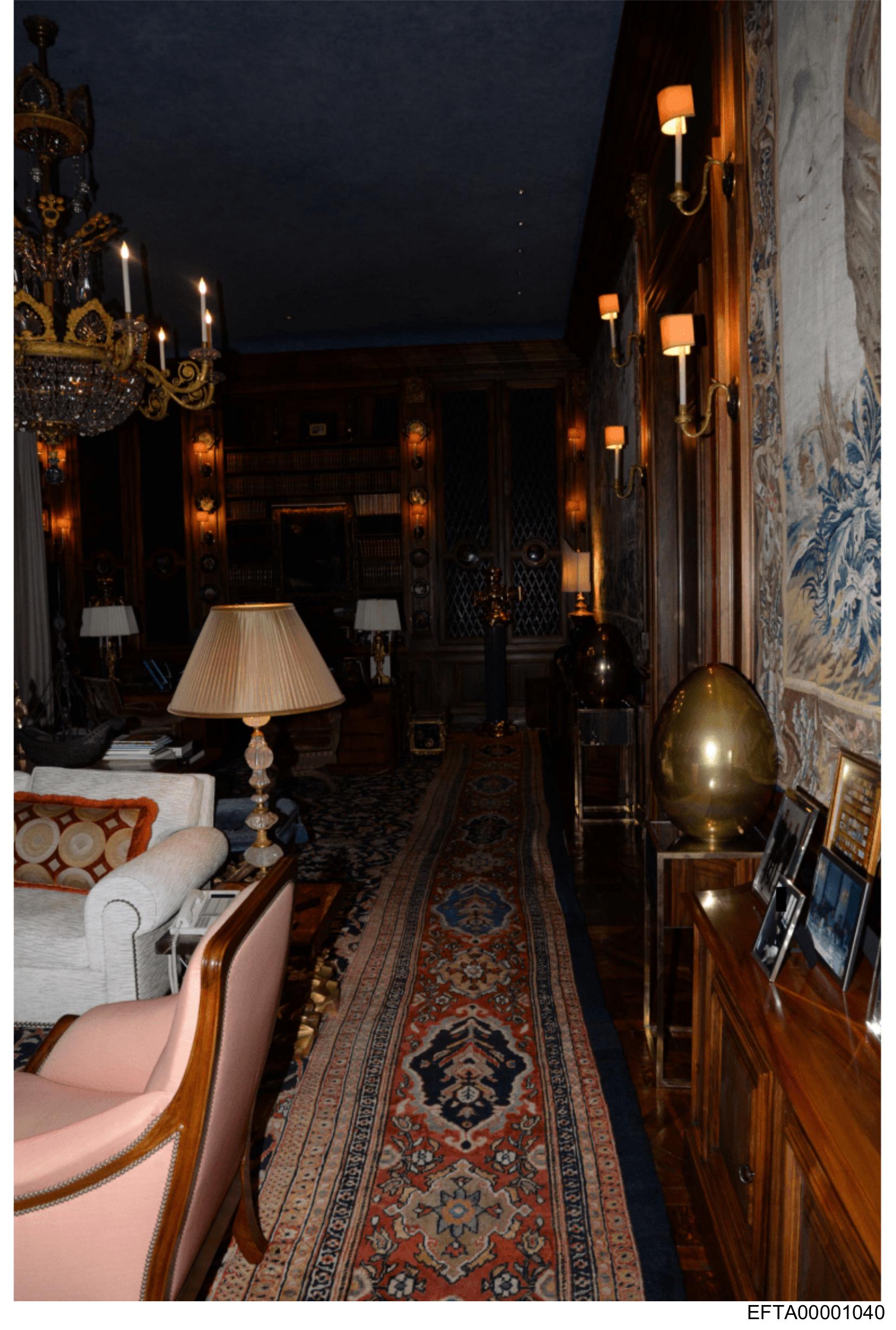 The image depicts an elegant room with a rich and luxurious interior design. The floor is covered with a large area rug featuring intricate patterns. On the left side of the frame, there's a pink armchair, providing a pop of color against the otherwise neutral tones of the space. In front of the chair, there appears to be a small wooden table or stand. The room is well-lit, with visible light fixtures that suggest a sophisticated ambiance. The walls are adorned with artwork and decorative elements, enhancing the room's overall aesthetic appeal. There are no texts or people discernible in this image. The style of the furniture and decor, along with the architecture visible in the background, hints at an upscale setting, possibly within a historic building or a high-end establishment. The focus is on the interior design elements rather than any specific activity or event taking place.