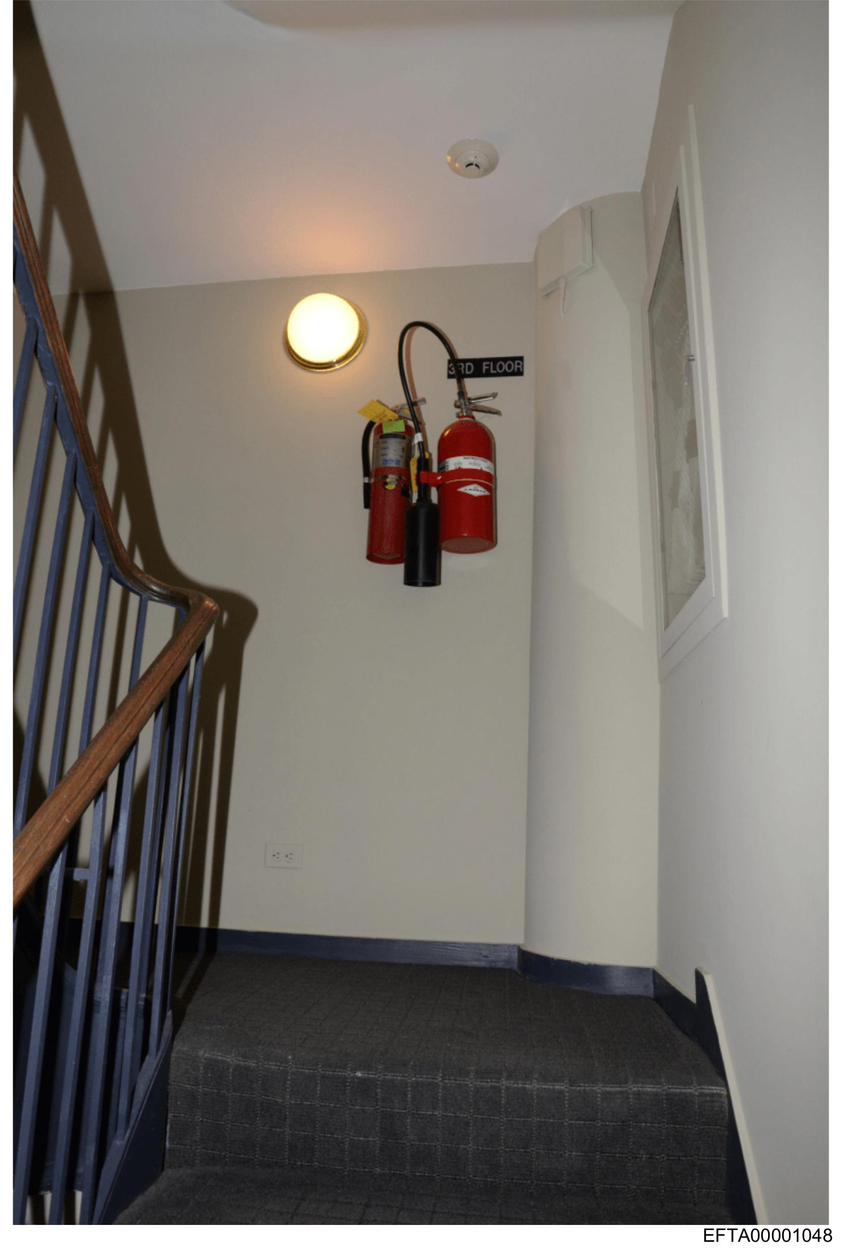 The image shows an indoor stairwell with safety equipment on the wall.
