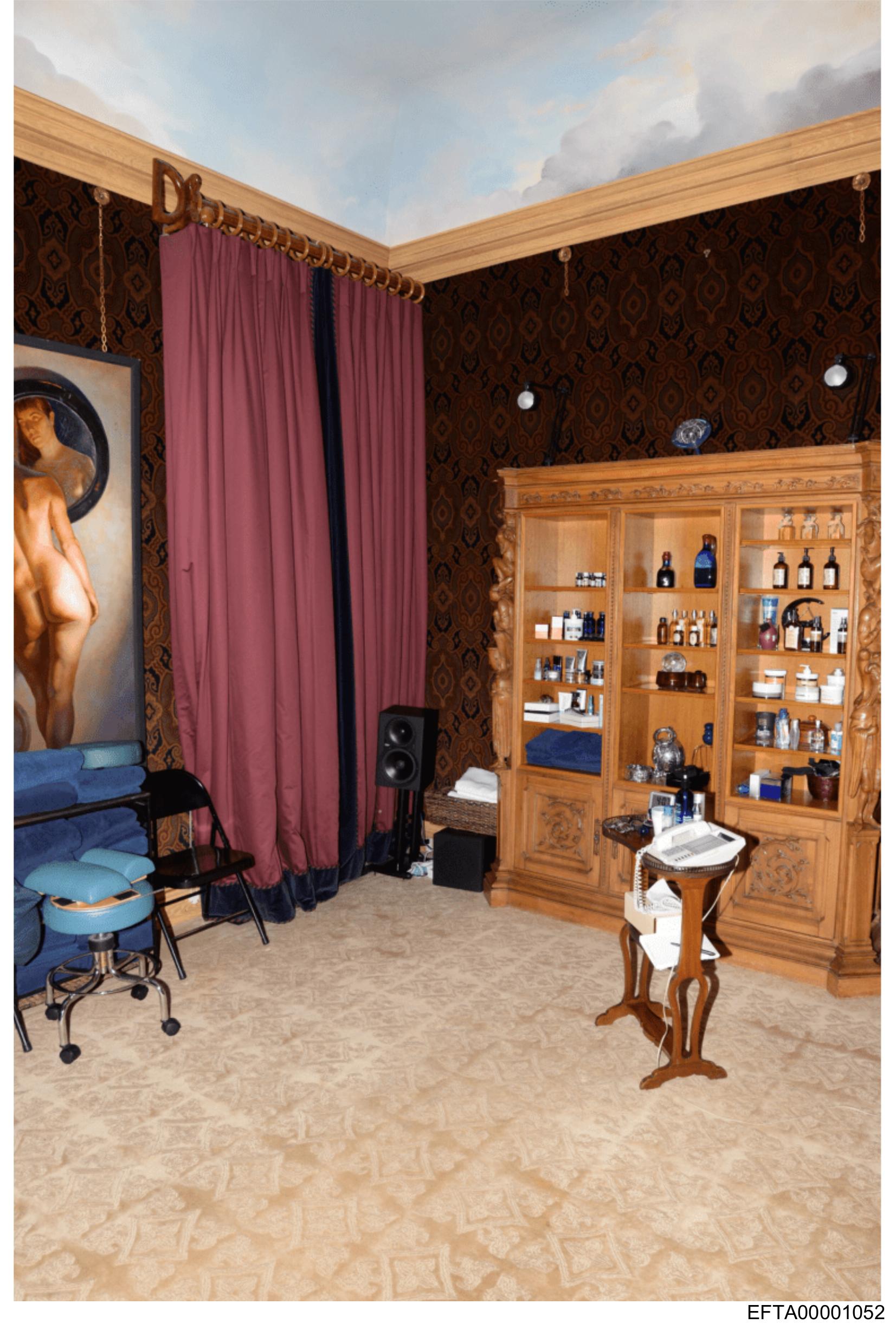 The image shows an interior space that appears to be a bar or lounge area. The room is decorated with vintage elements and patterned wallpaper. A wooden cabinet filled with bottles suggests the presence of a bar counter. There's also a seating arrangement featuring a high-backed blue chair and what seems to be a plush upholstered bench. The ceiling features decorative detailing, and on one side, there are curtains drawn back to reveal an image or artwork. In the foreground, there is a piece of furniture that might be used for sitting, possibly another seat or couch. The overall atmosphere conveys a sense of elegance and sophistication.