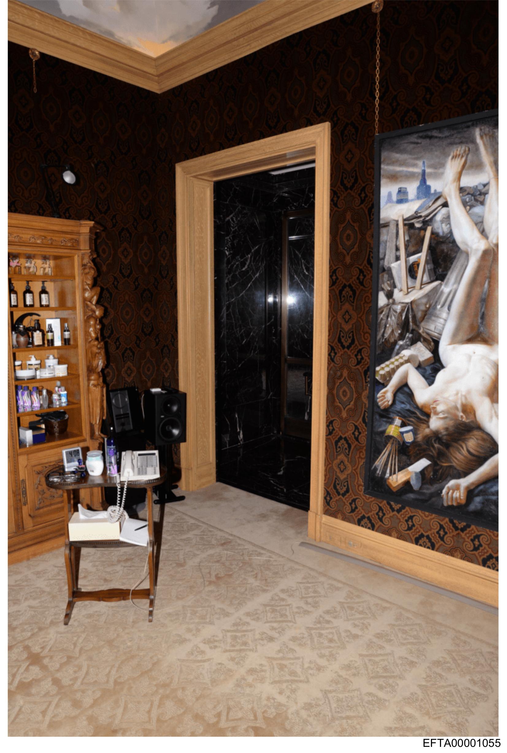 The image depicts an opulent room with a richly patterned wallpaper and marble flooring. A large painting featuring classical figures dominates the back wall to the left. To the right, there is a wooden cabinet filled with what appears to be bottles of alcohol or wine. In front of this cabinet stands a small table with various items on it. The overall style of the room suggests luxury and a sense of historical grandeur.