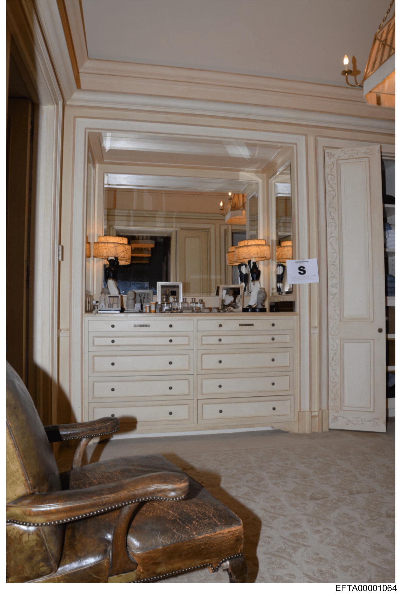 The image shows an interior space with a room that features a large wardrobe and drawers on the left side. Above the wardrobe, there is a mirror reflecting part of the room's lighting fixtures. To the right, a chair with a high backrest can be seen, suggesting this might be a dressing or bedroom area. The overall style suggests an elegant interior design, possibly in a luxury home or boutique hotel setting. There are no visible texts, people, or other distinctive locations that provide additional context within this frame of the image.