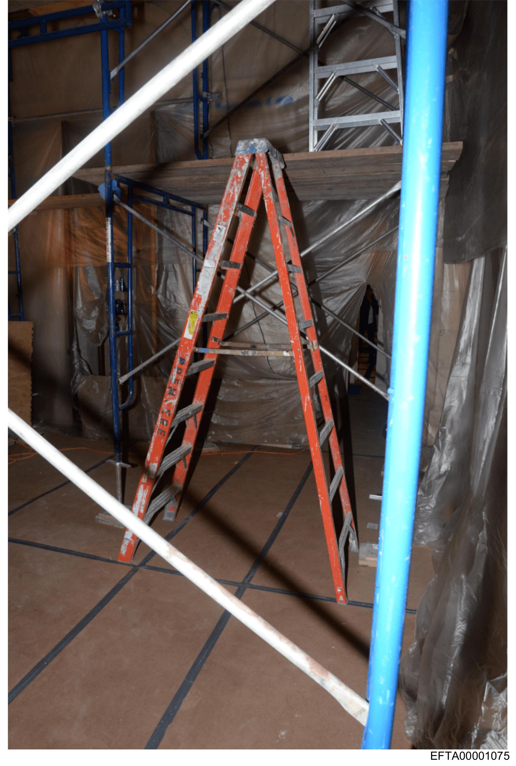 The image shows a construction site with scaffolding and protective sheeting around the structures being worked on. In the foreground, there is an A-frame ladder leaning against the scaffolding, suggesting that it's used for climbing to higher levels of the building under construction. The lighting appears dimmer than what one would expect in a brightly lit room, indicating either poor lighting or a focus on the ongoing work rather than creating a well-lit space. There is no visible text, people, or distinctive locations in the image that can be confidently described from this perspective.