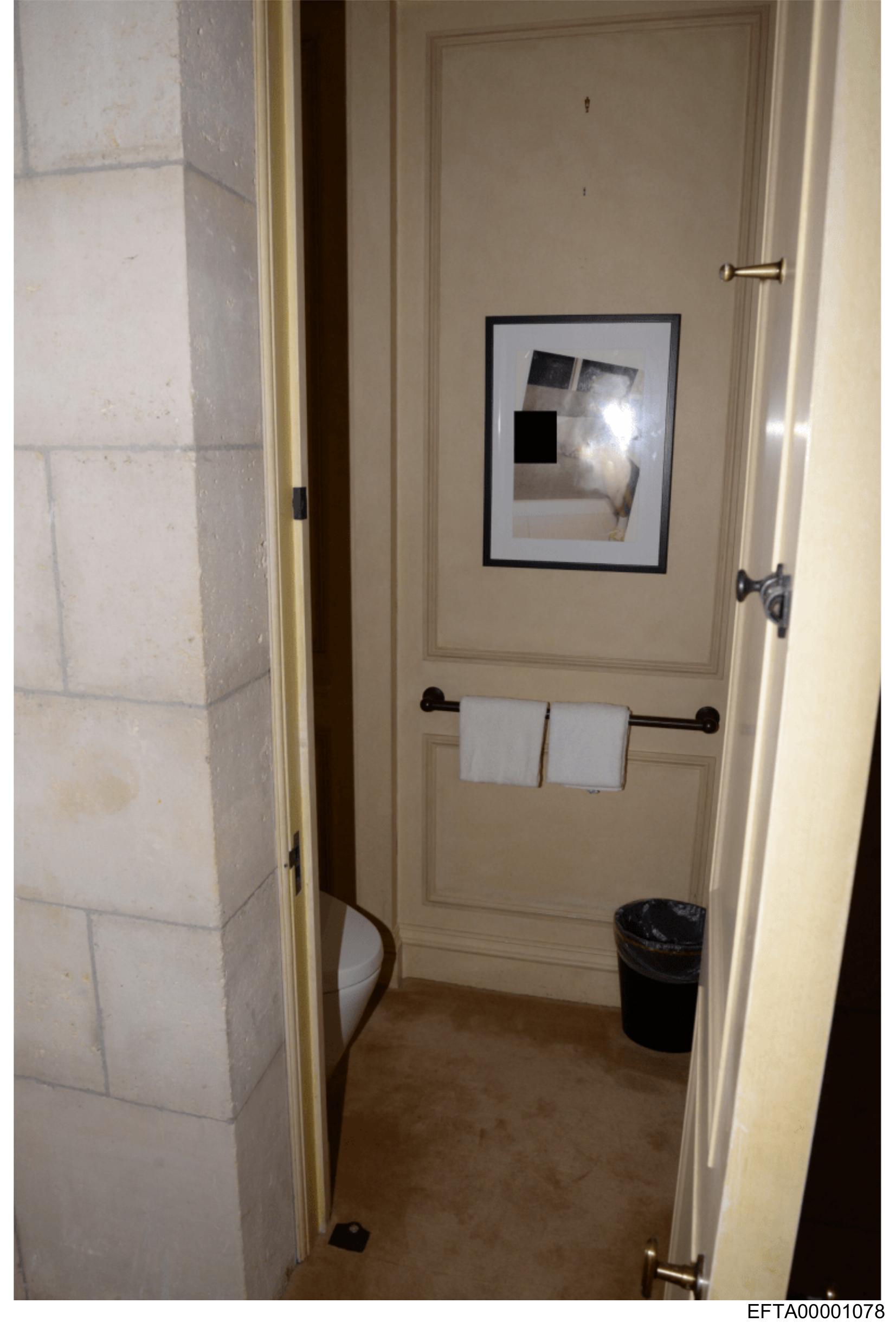 The image depicts the interior of a small bathroom with a somewhat cramped layout.