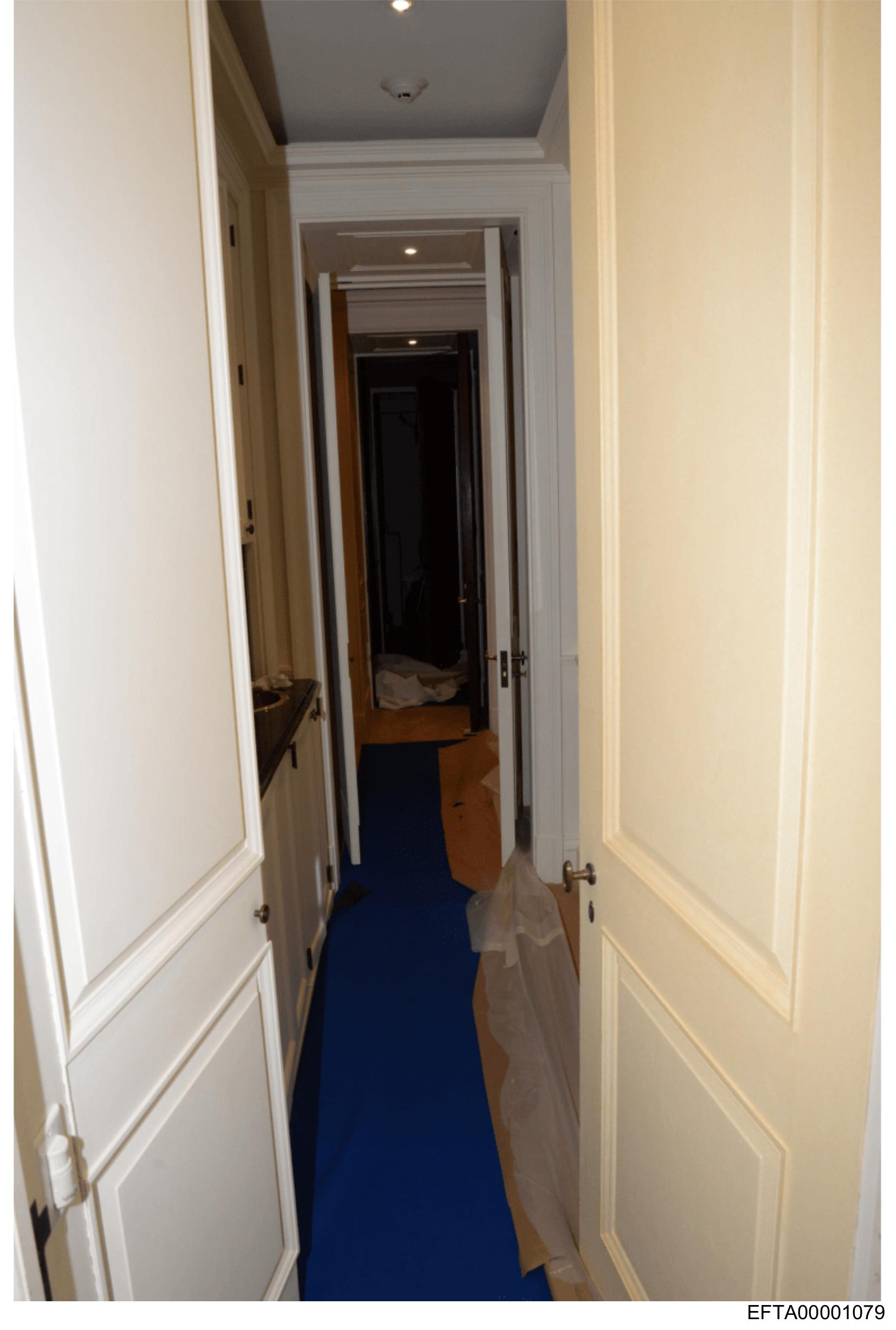 The image depicts an interior hallway viewed from the end of one corridor towards another.