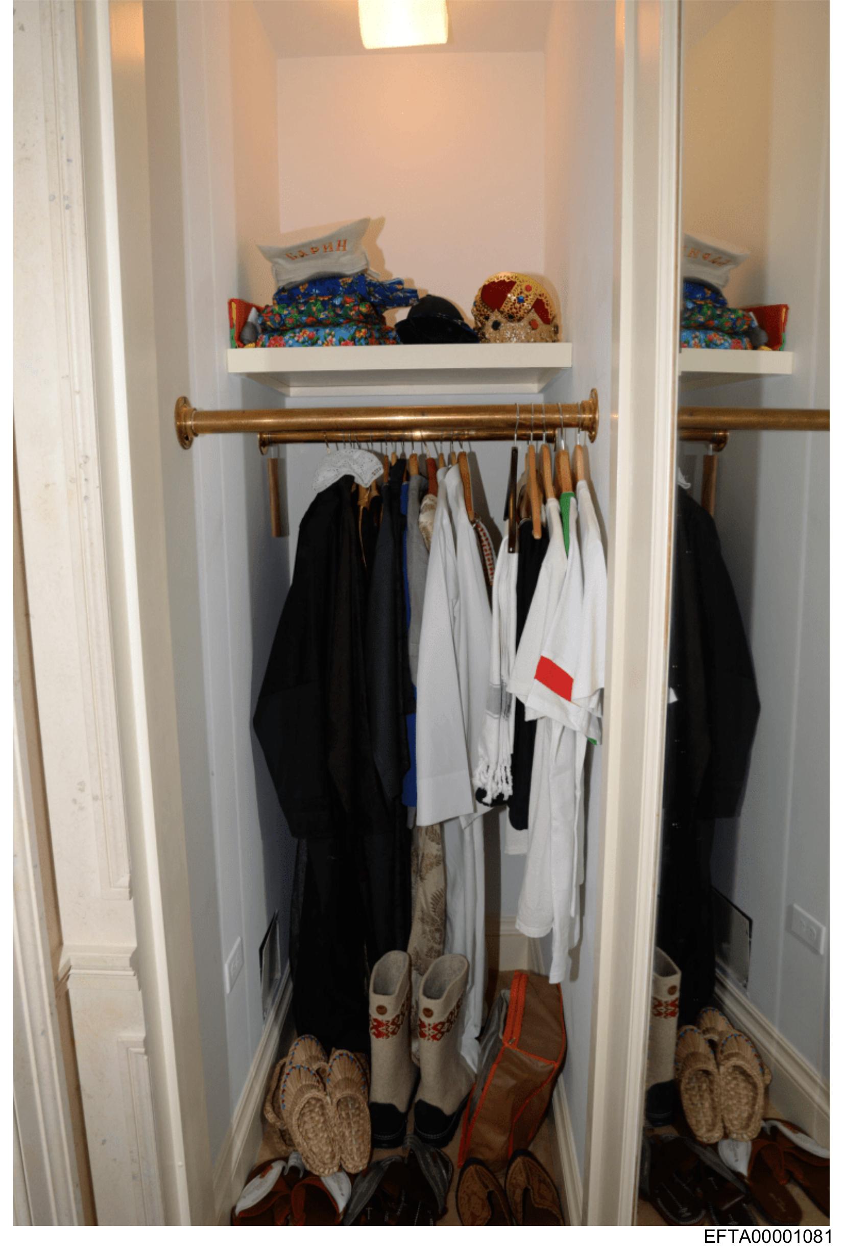 The image shows the interior of a closet with shelves and hanging clothes.