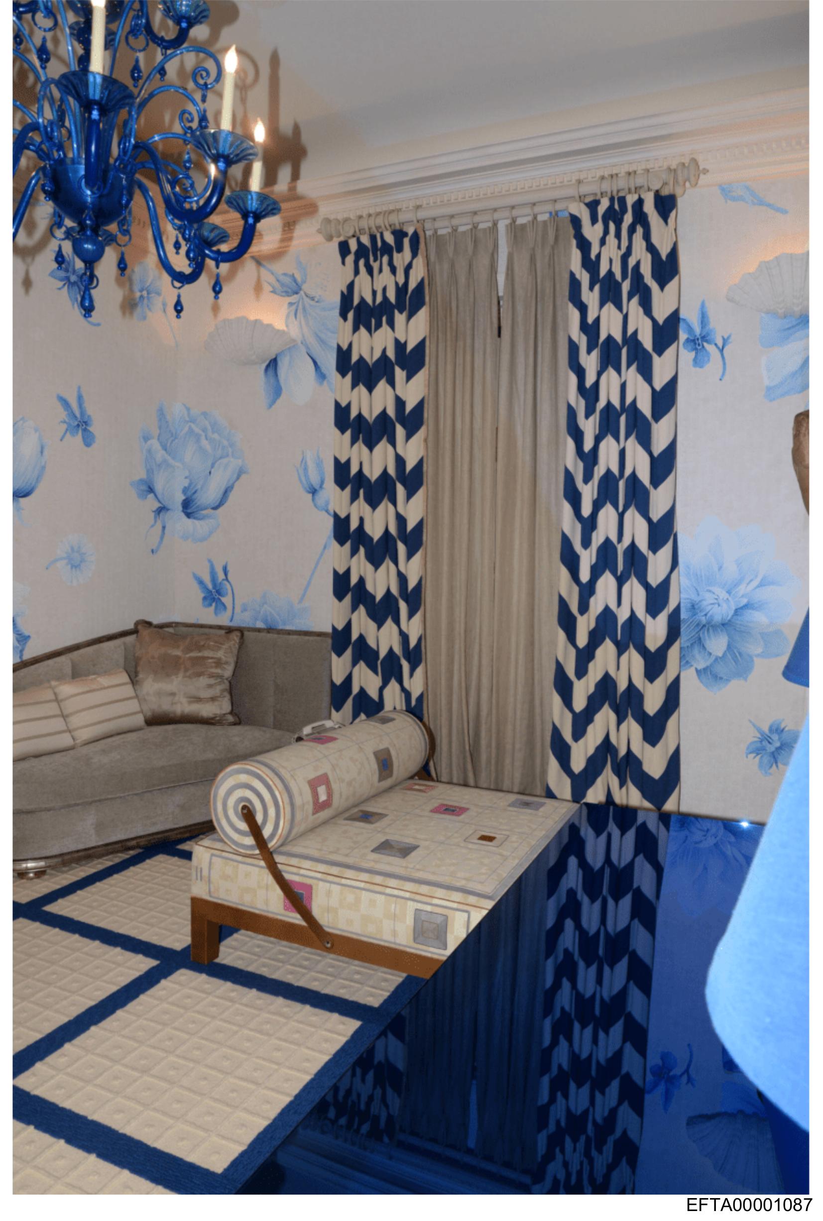 The image depicts an interior room that is well-decorated. In the foreground, there's a blue and beige striped sofa flanked by patterned cushions. A patterned ottoman with wooden legs sits in front of the sofa. The walls are adorned with wallpaper featuring a floral design, predominantly in shades of blue. Above the sofa hangs an ornate chandelier against a white ceiling. To the right, there is a window with a sheer curtain that has a geometric pattern. A wall-mounted shelf displaying decorative items can also be seen to the left of the frame. The overall ambiance suggests a cozy and stylish living space.