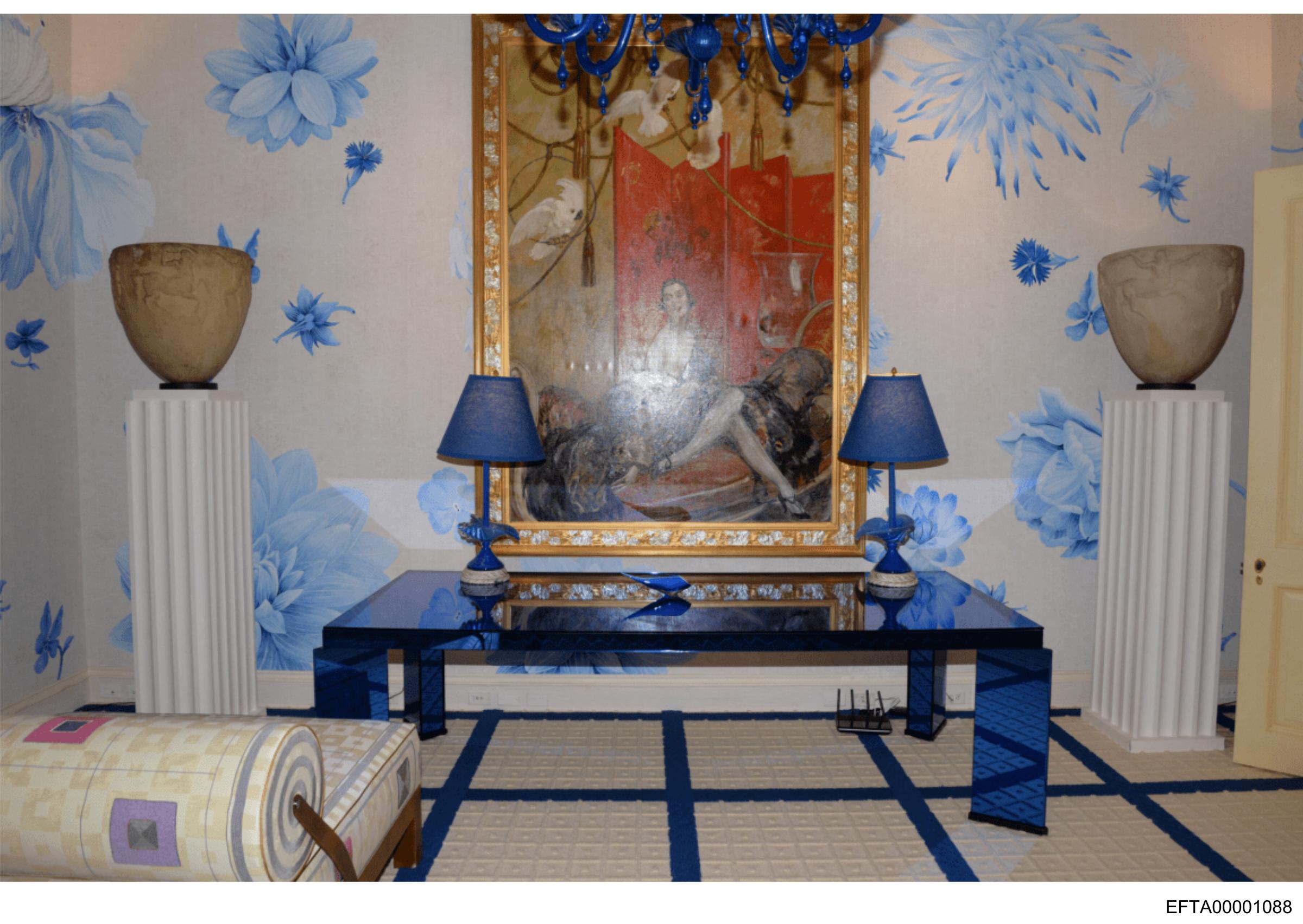 The image shows an elegantly decorated room with a blue and white color scheme.