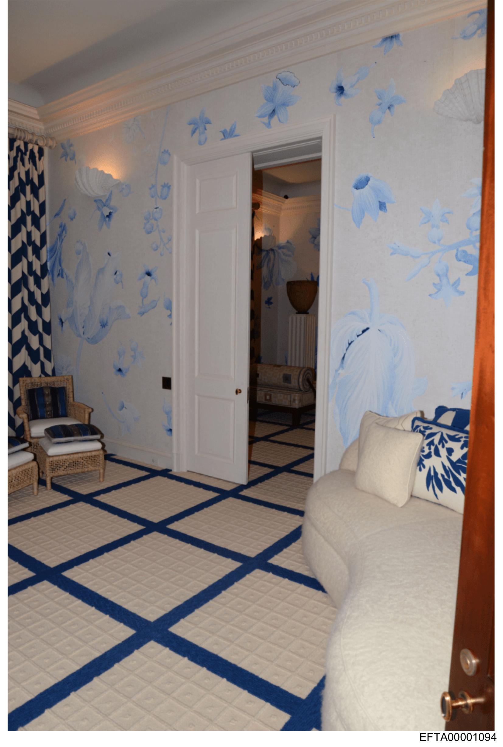 The image captures a cozy living room bathed in soft light. The walls, adorned with blue floral wallpaper, add a touch of elegance to the space. The carpet below, patterned in shades of blue and white, complements the wall design, creating a harmonious color scheme throughout the room. On one side of the room, there's a comfortable couch inviting relaxation. Above it hangs an intriguing painting that adds character to the space. A door on the opposite side offers a glimpse into another room beyond. The image as a whole exudes warmth and tranquility, making this living room appear like a perfect retreat for quiet moments.