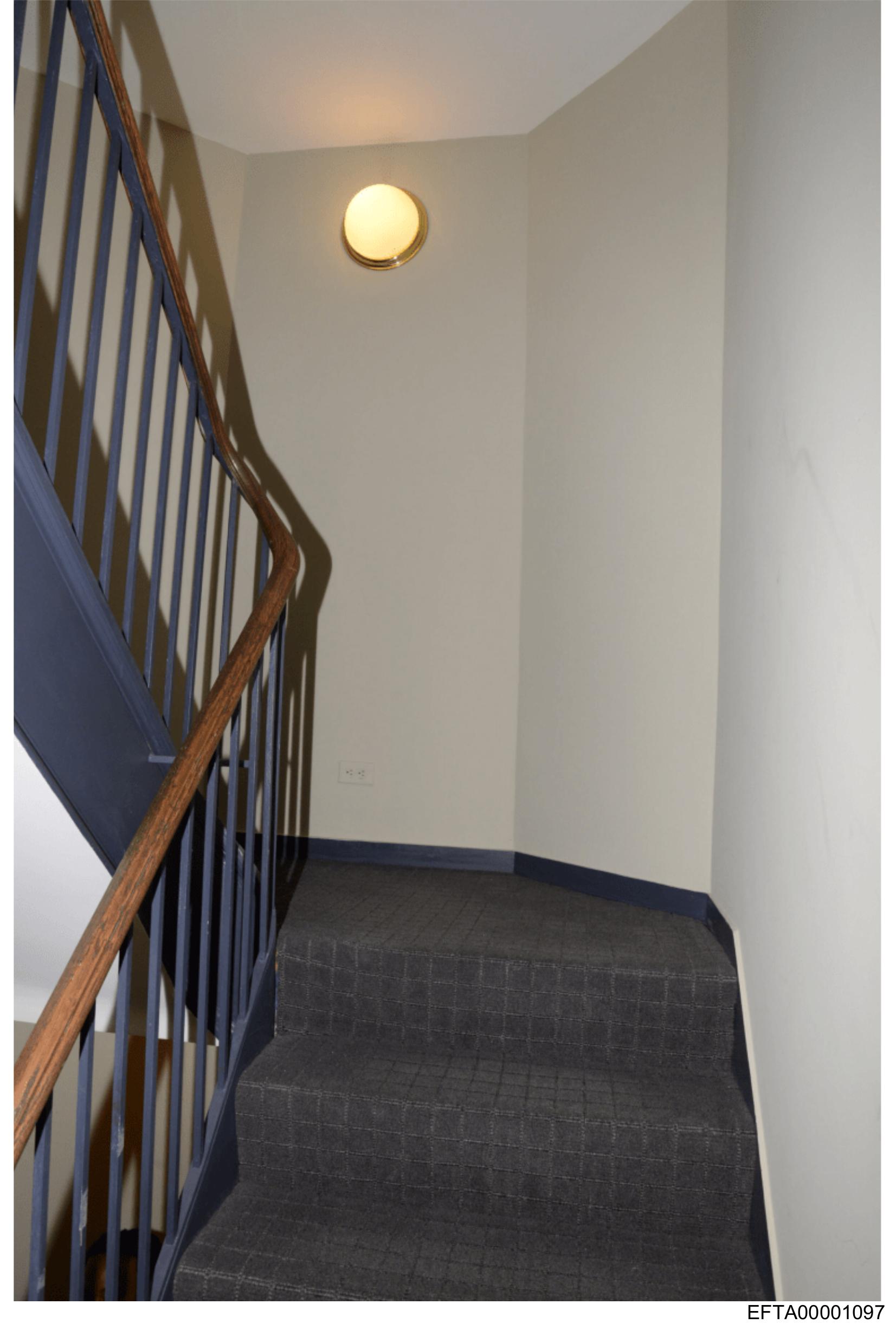The image shows an interior staircase with a dark rail and steps that ascend from the foreground to the background.