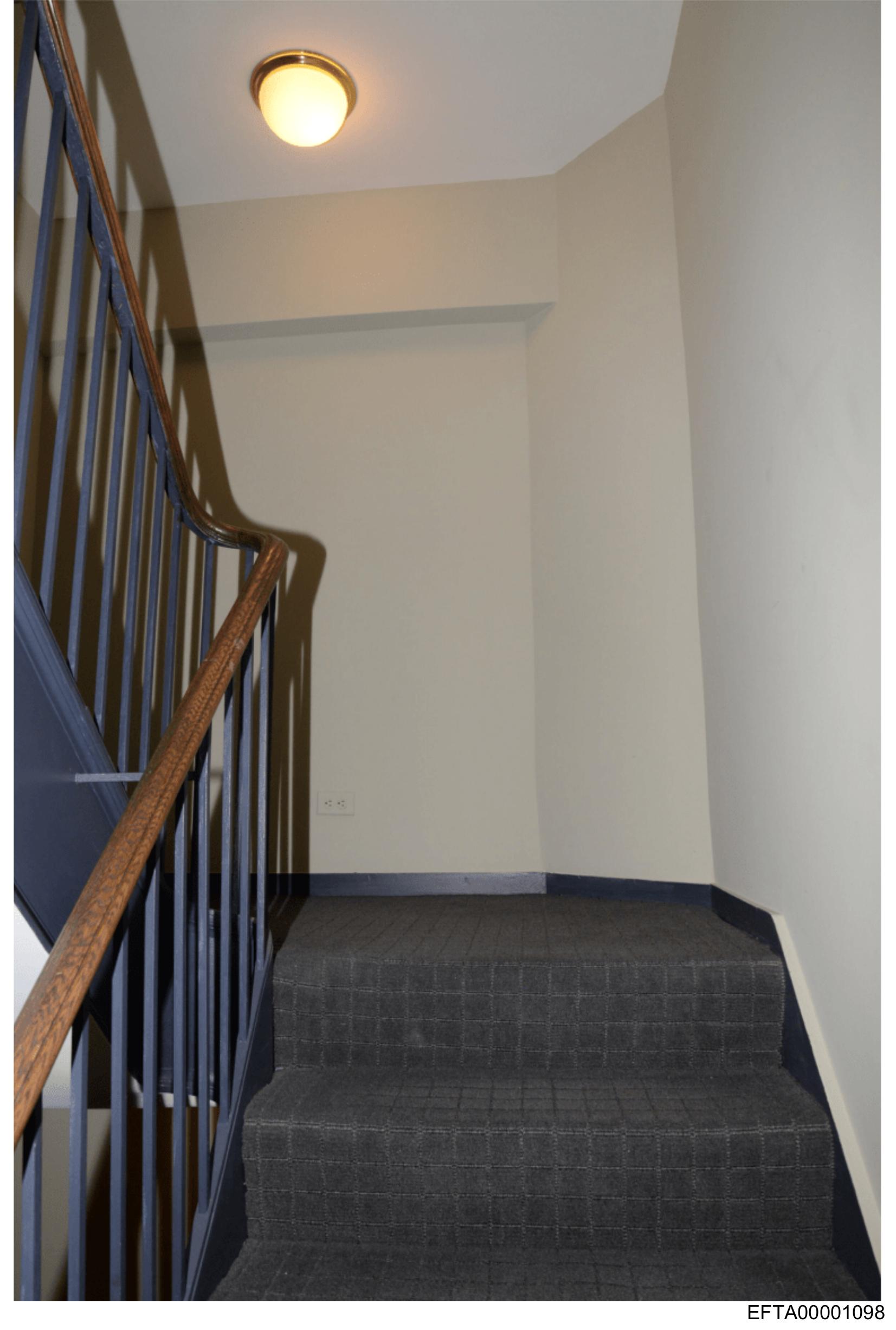 The image depicts an indoor staircase with a dark wood banister and steps that appear to be made of the same material.