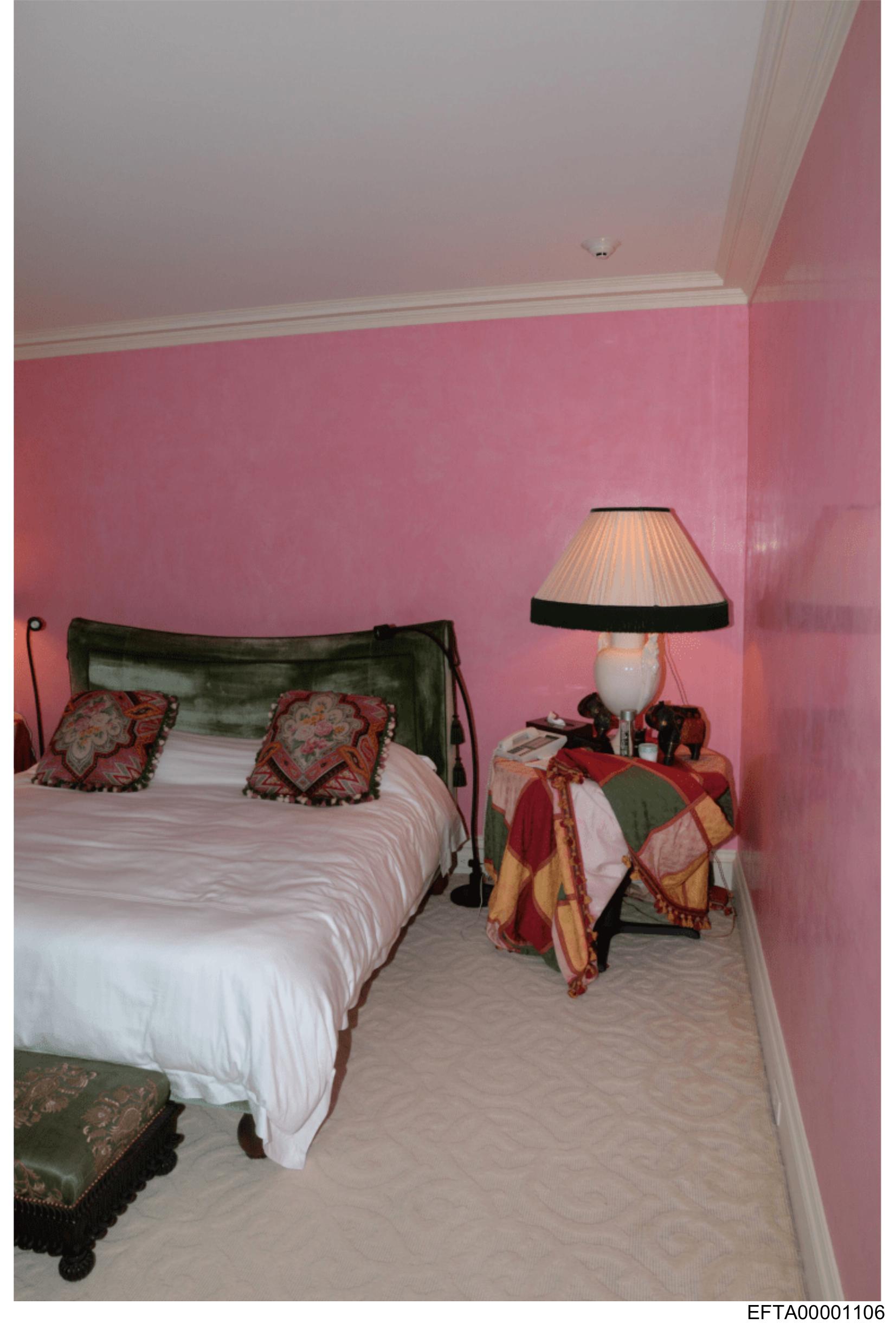 The image shows a small bedroom with pink walls and light beige carpeting.