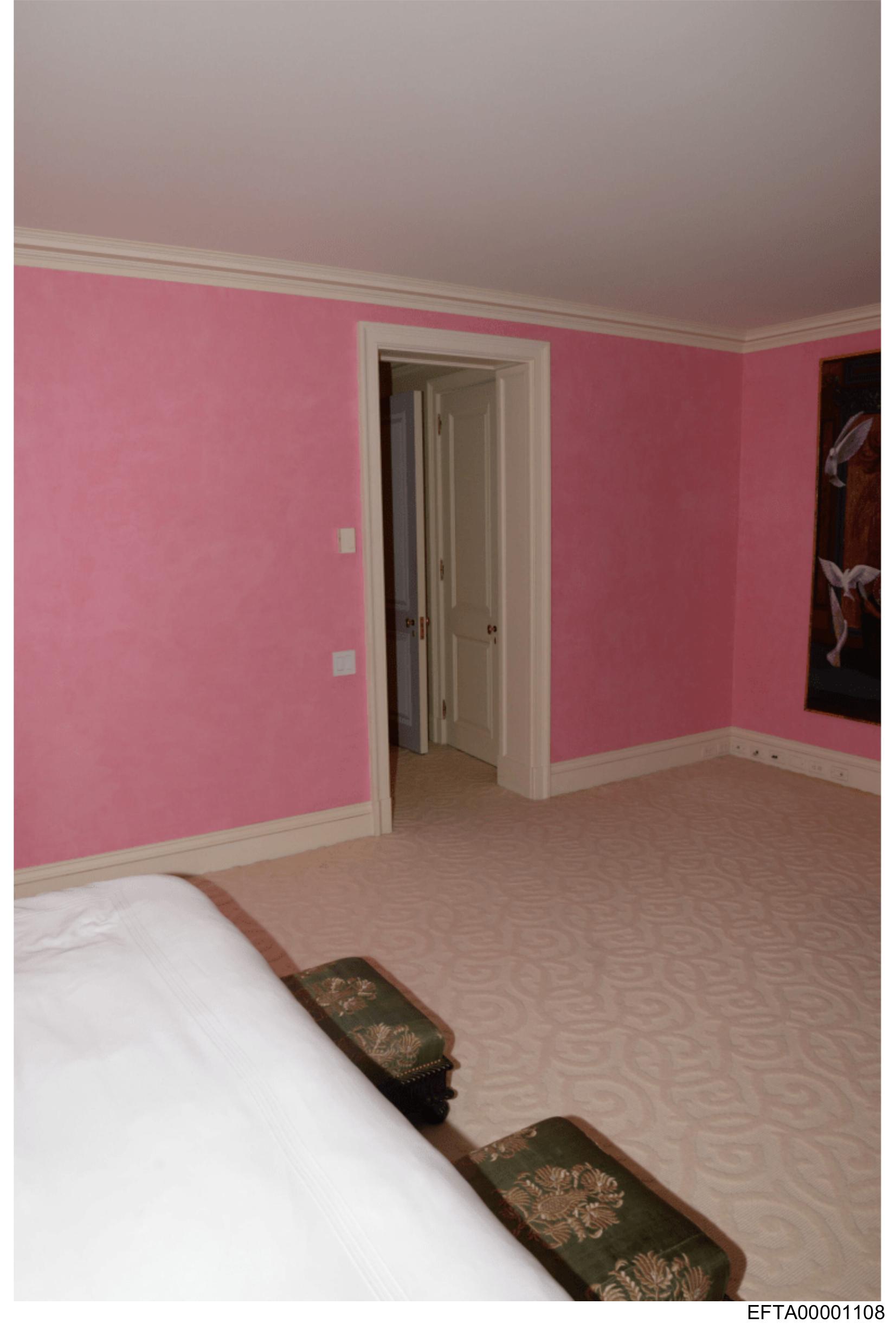 The image shows an interior space with a pinkish-purple color scheme. There is a doorway at the end of the room leading to another area that appears less illuminated. To the right, there is a partial view of what seems to be a poster or artwork on the wall. In the foreground, there's a piece of furniture with white sheets and pillows, suggesting this could be a bedroom setting. The floor has a patterned carpet. The image has a text overlay at the bottom left corner that reads "E1000_00" which might indicate a file or photo numbering system.