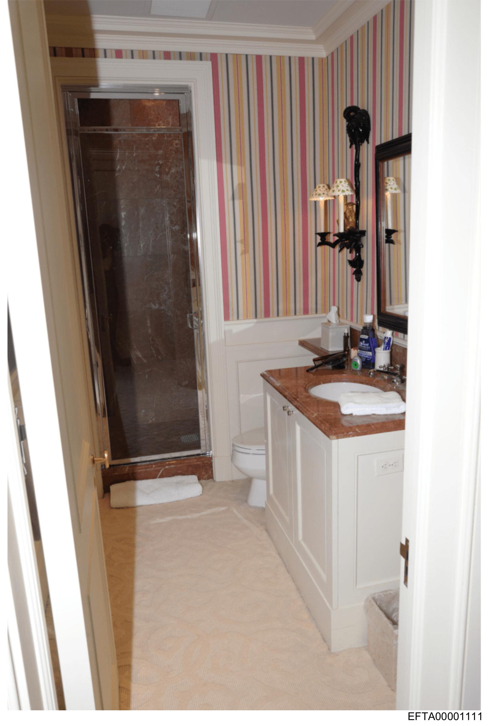 This is an image of a bathroom with a distinctive design. The walls are covered with vertical stripes in varying widths and colors that give the space a vibrant, retro feel. There's a white clawfoot tub to one side, partially filled with water, indicating it has been used or is being prepared for use. Above the bathtub, there is a closed white window. To the right of the image, there's a sink topped with a dark wood vanity that houses various toiletries and personal care items. A large mirror with an ornate frame hangs above the sink area. The floor appears to be made of tiles in a cream color that complements the overall decor of the bathroom.